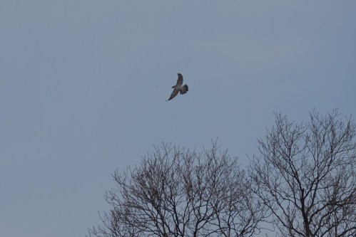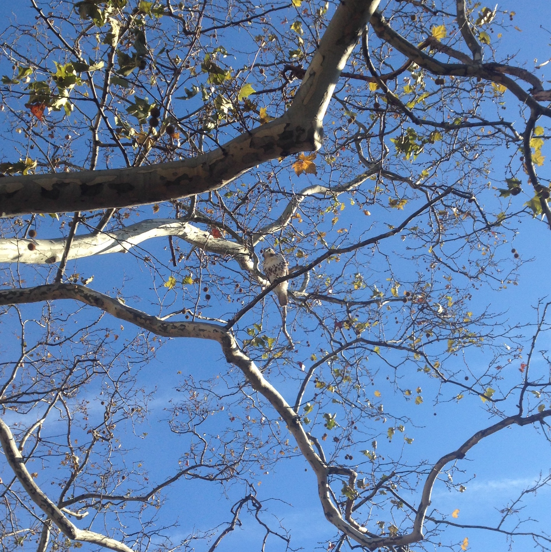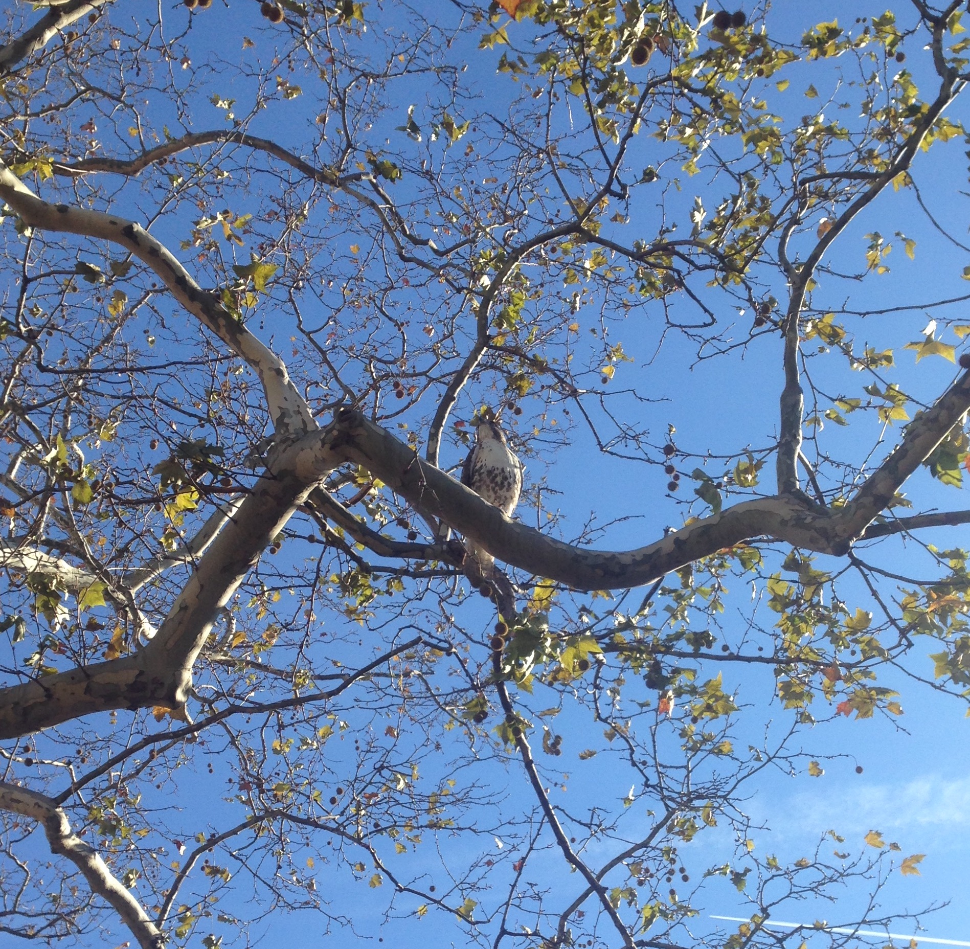 As I turned the corner onto 41st Street across from the park, preparing for the hike up the moraine, I noticed a big bird take off from the slope above the park’s retaining wall. It was a Red-tailed Hawk, of course, and it landed in a London plane tree anchored in the sidewalk. Crossing the street to stand beside the tree’s bole was but a moment’s work for me. The hawk paid no heed to my efforts, nor to three other bipeds passing below. Instead, it swallowed some food in just a few bites. No feathers flew, so perhaps it was a small mammal. The bird was about 15 feet away from me. That’s some FID — flight initiation distance to the ornithologists, a mark of habituation to humans. In fact, the bird hopped down to a lower branch that was even closer to me. It was one of my closest encounters ever with these big raptors, an almost daily sight here in Brooklyn.