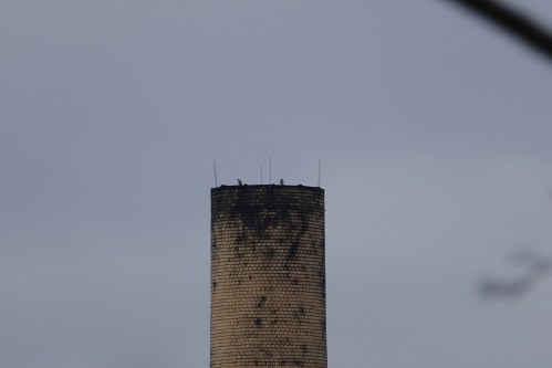 A pair of Peregrines. They’ve been seen up here almost every day for months now. This morning: one was there when I first looked at 7:09am; both there at 7:18am. Only crappy weather keeps them elsewhere.