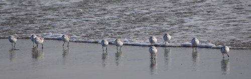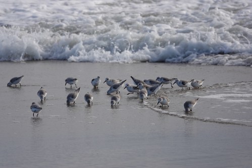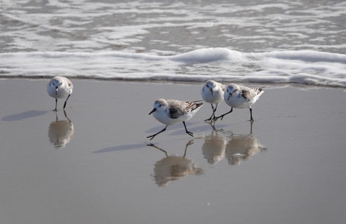 Darting before the surf, scurrying, probing, running, occasionally giving a squawk and flying.