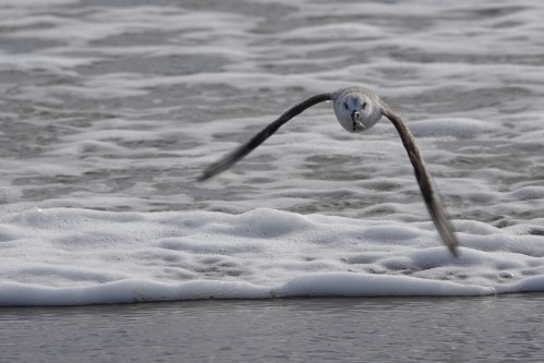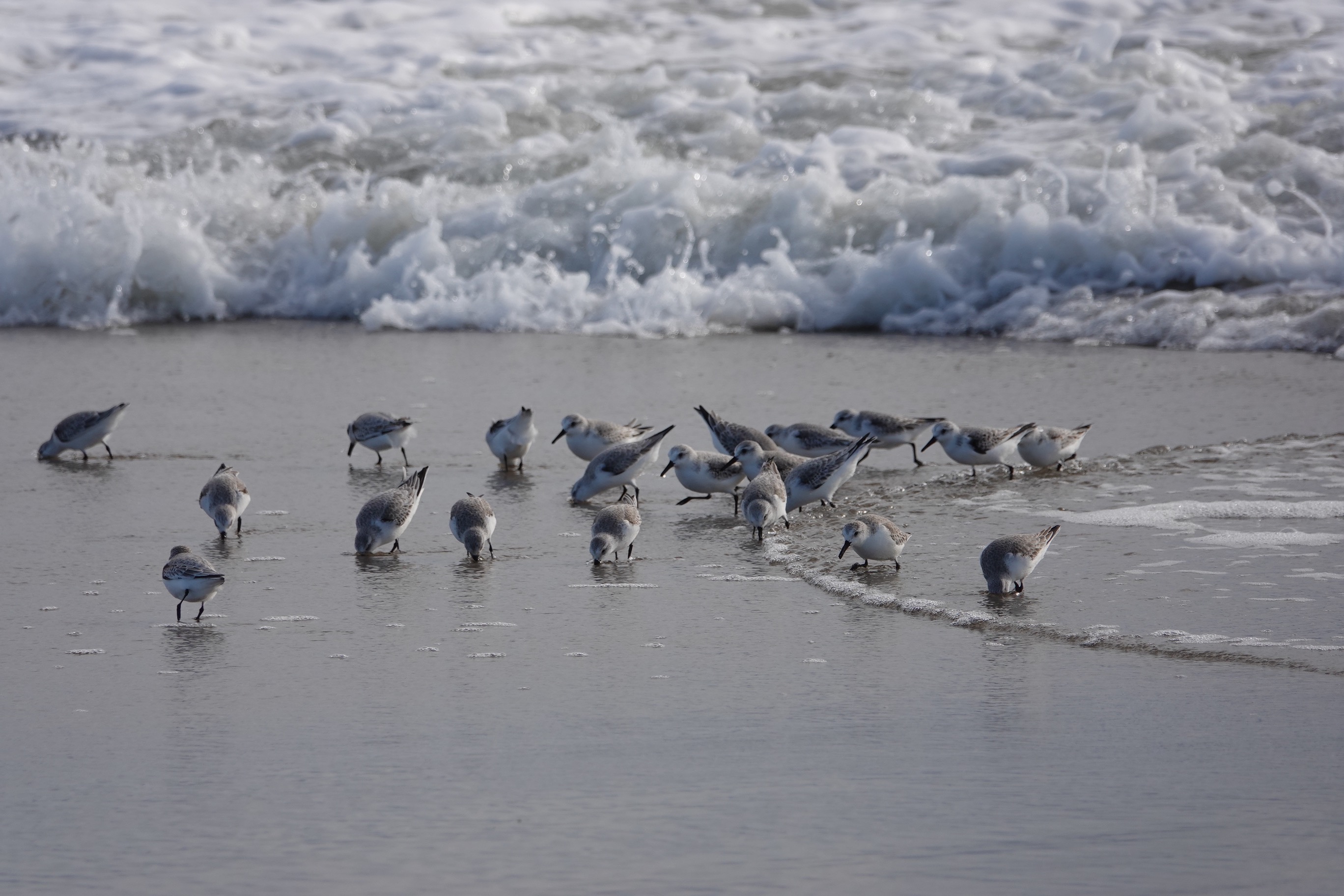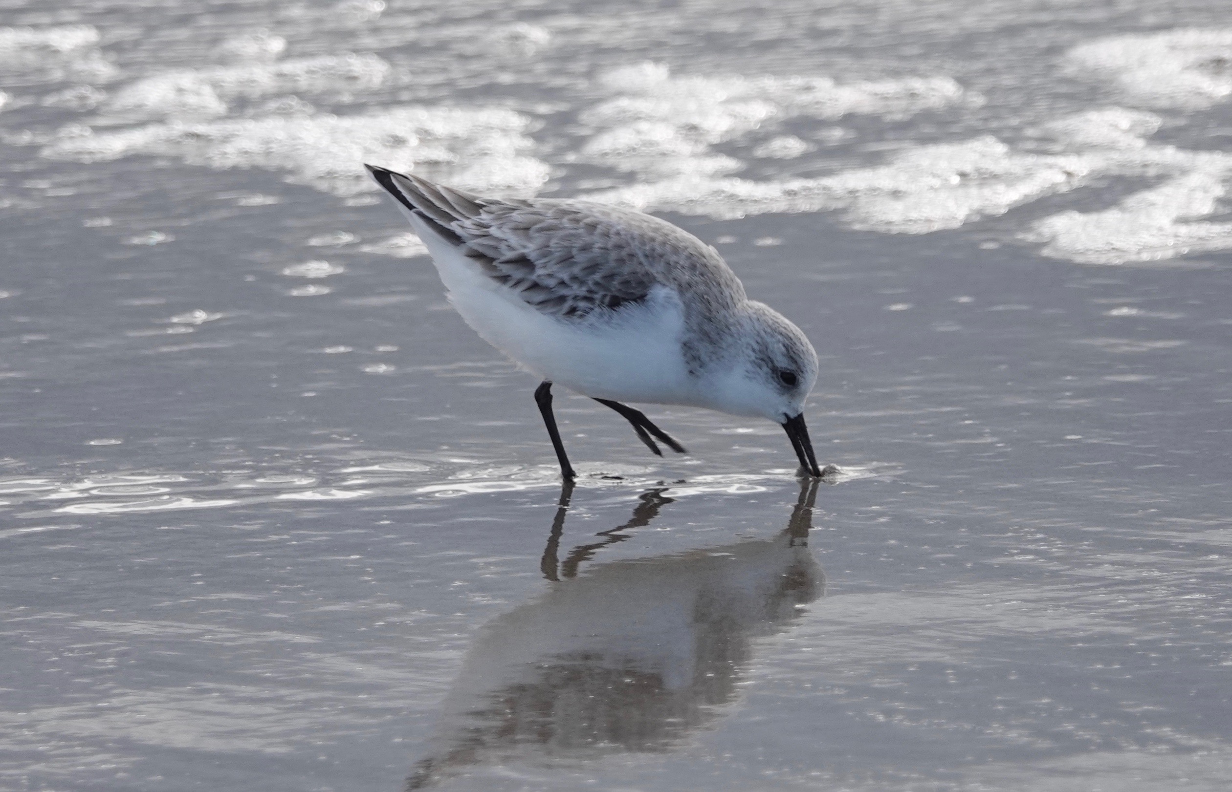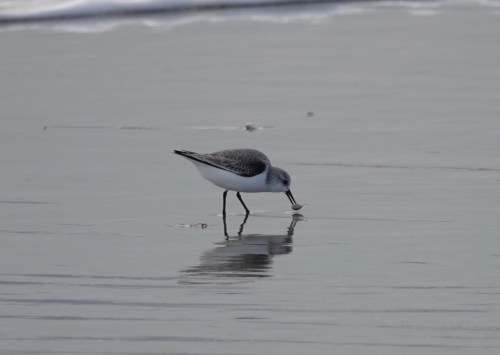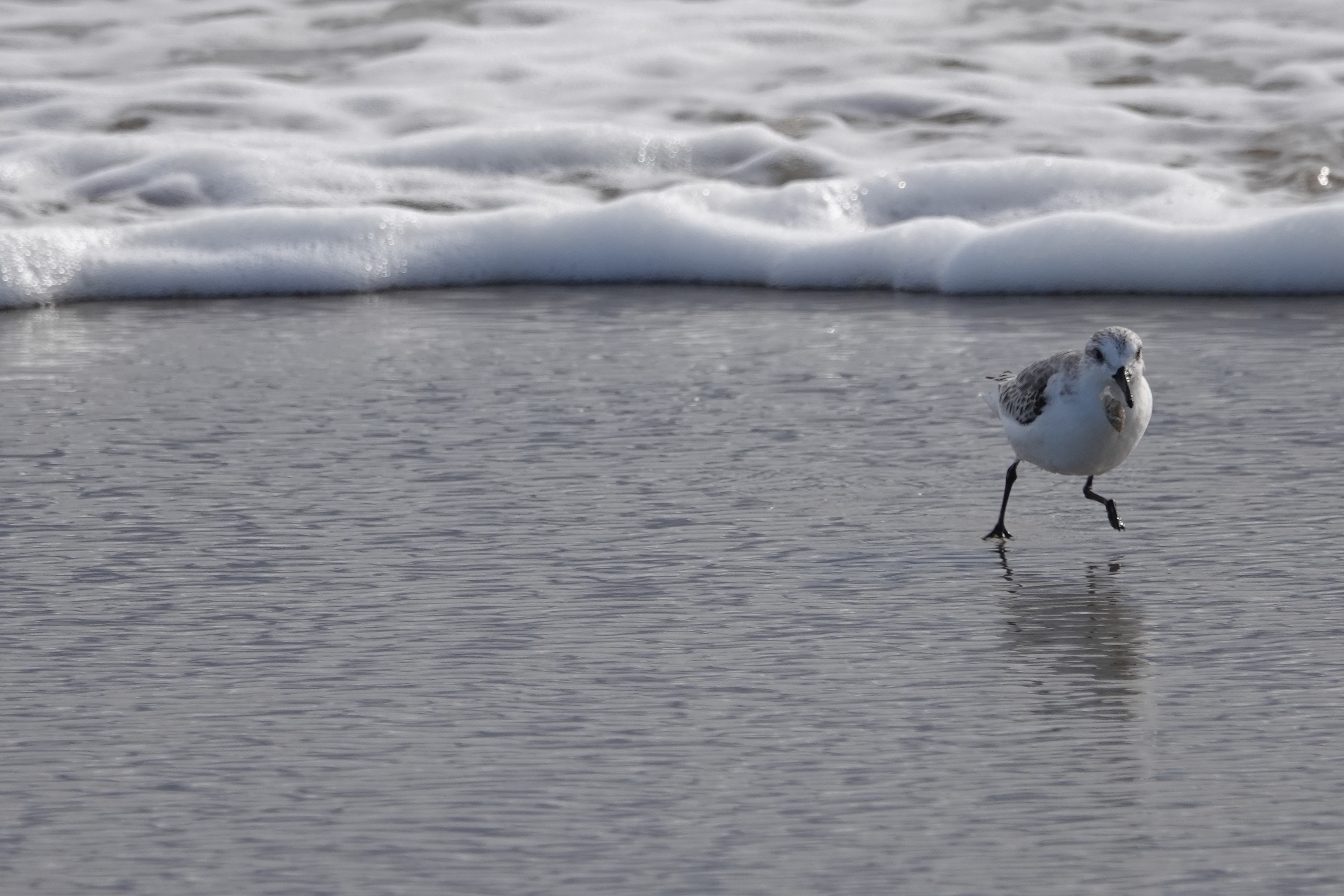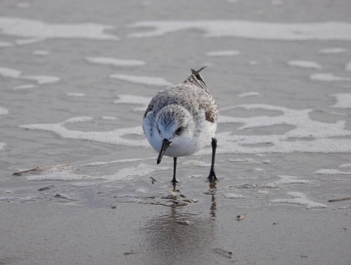 Darting before the surf, scurrying, probing, running, occasionally giving a squawk and flying.