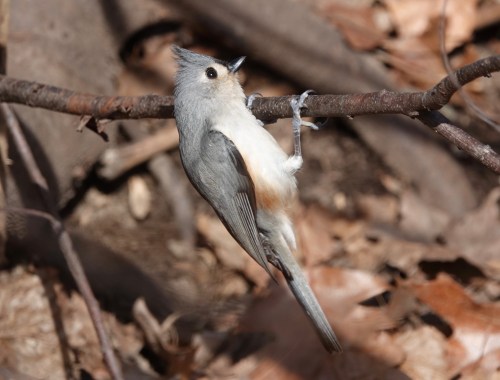 Wind-tussled Tufted Titmouse in a beech tree with a few old leaves hanging on.