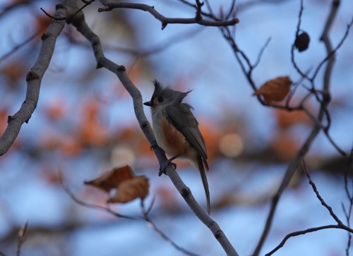 Wind-tussled Tufted Titmouse in a beech tree with a few old leaves hanging on.