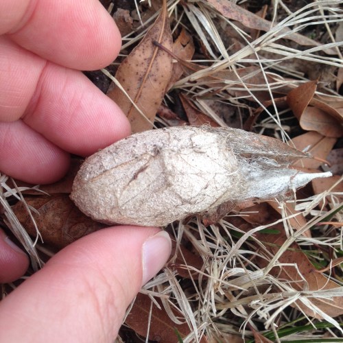 Inside this cocoon, and you could hear it when gently shaken, was the pupa of a big moth. One of the Saturniidae silkworm moths, I believe. (Compare with these.) Normally suspended from tree or other structure, it had evidently fallen from the oak. That should be ok, but there are certainly risks: rodents will eat them if they find them.