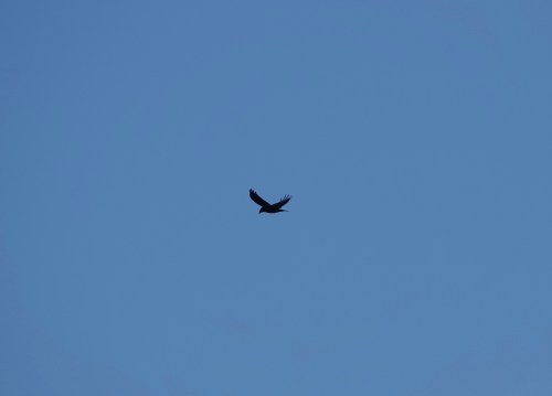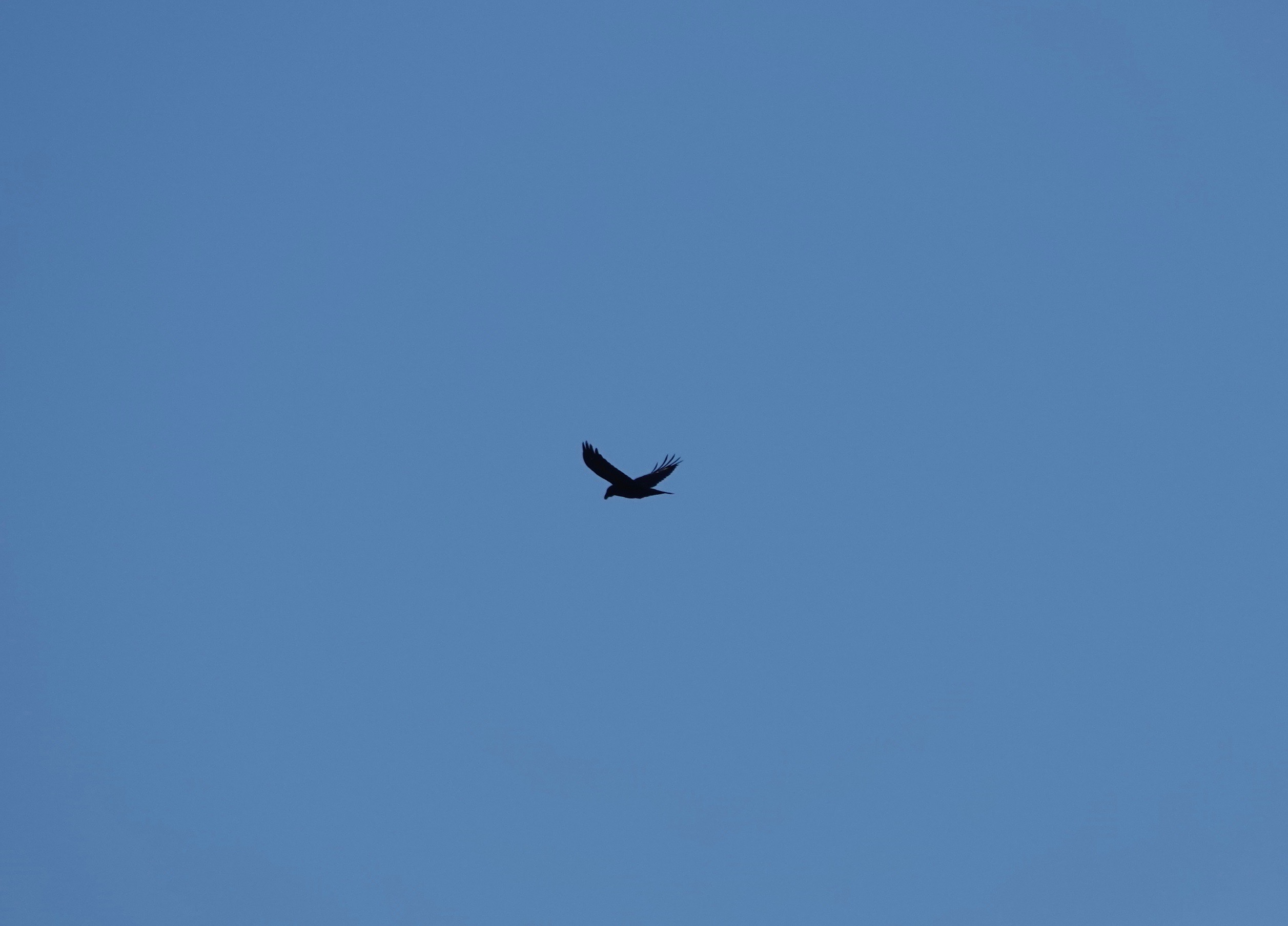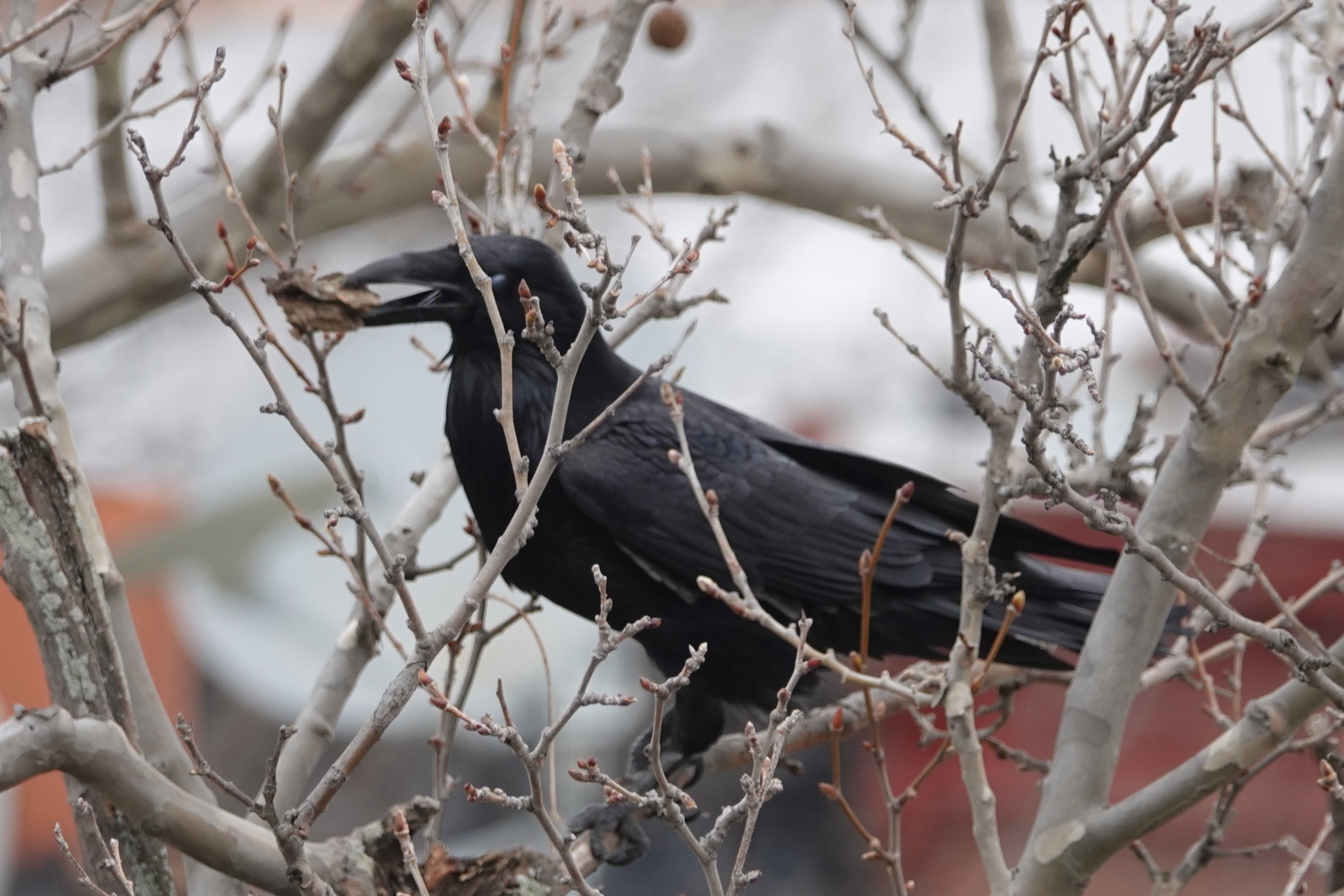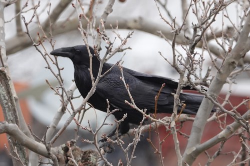 I usually hear them before I see them. Brooklyn’s Common Ravens regularly fly across the bow, the view from here down to the coast of Upper New York Bay. They are generally quite vocal, which helps to distinguish them from the crows from afar. In this case, the somewhat swine-like krongking was right overhead. The bird swirled down from above my apartment building and landed in the Kestrel Tree across the street for just a moment.