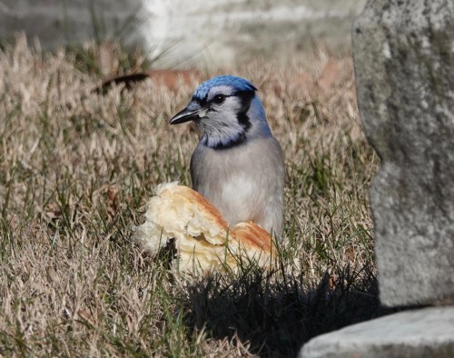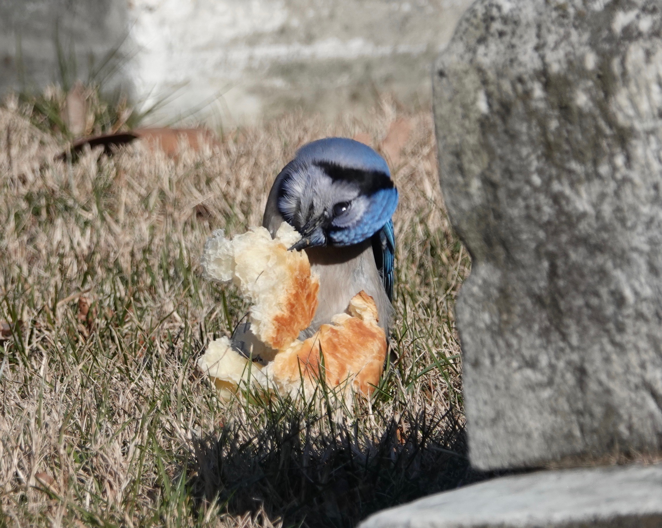 In my experience, they’re actually quite shy when it comes to us bipeds. They rarely get in photographic range. Half a dozen were going after this croissant, but they split six ways to Sunday when I, cautiously walking like a bird-watcher, entered their airspace, an airspace easily twice the distance of most other species in Green-Wood this time of year.
