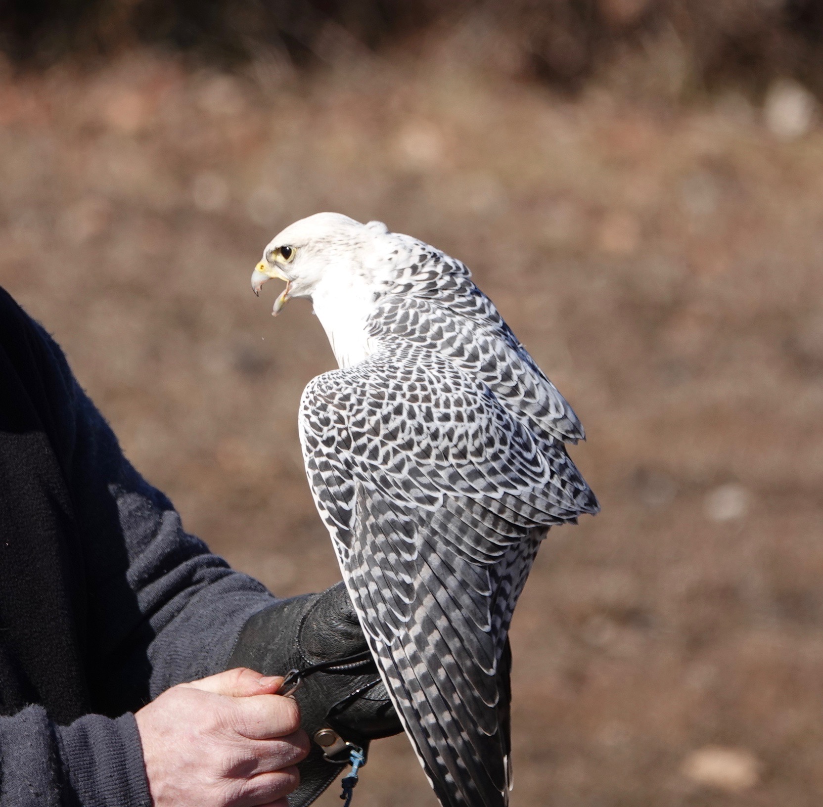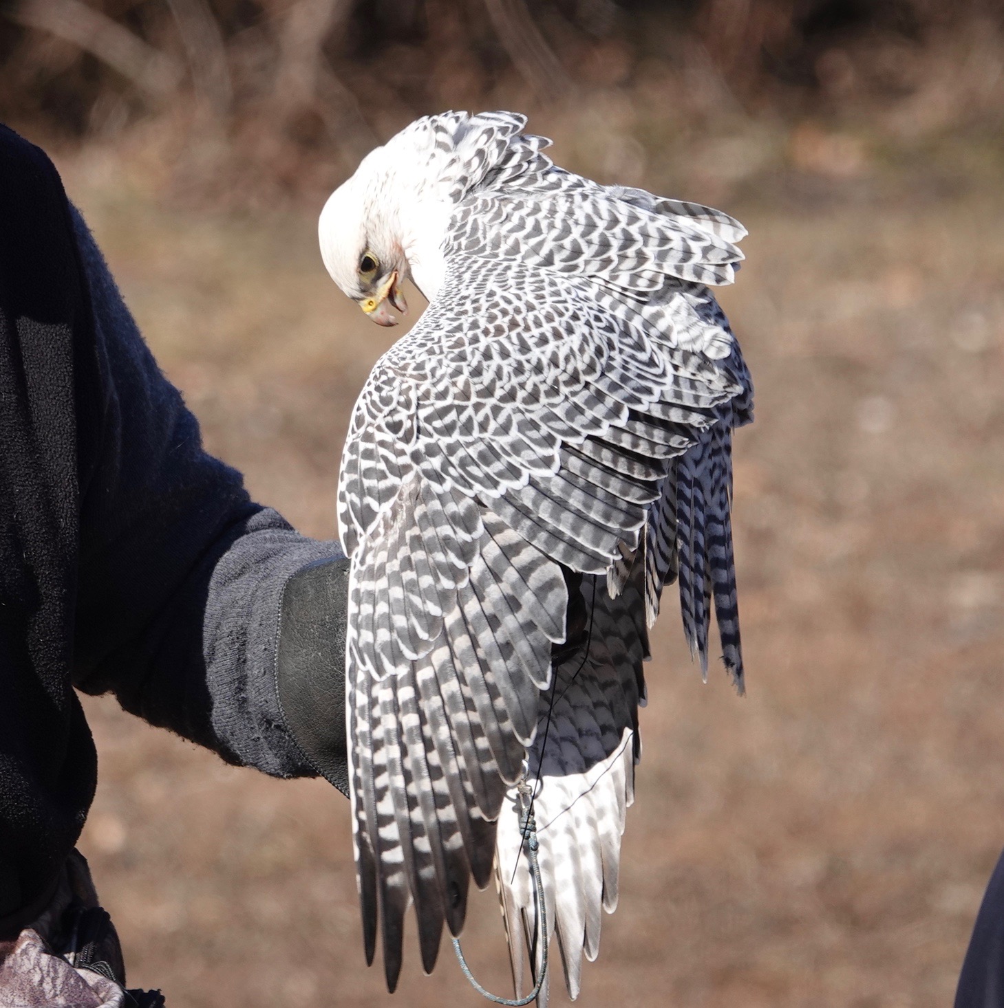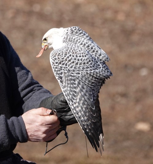 Wild birds are broken, or tamed if you dare, by starving. Captive raptors hunt, or, in this case, perform, precisely because they’re hungry; the lure is baited with food.
