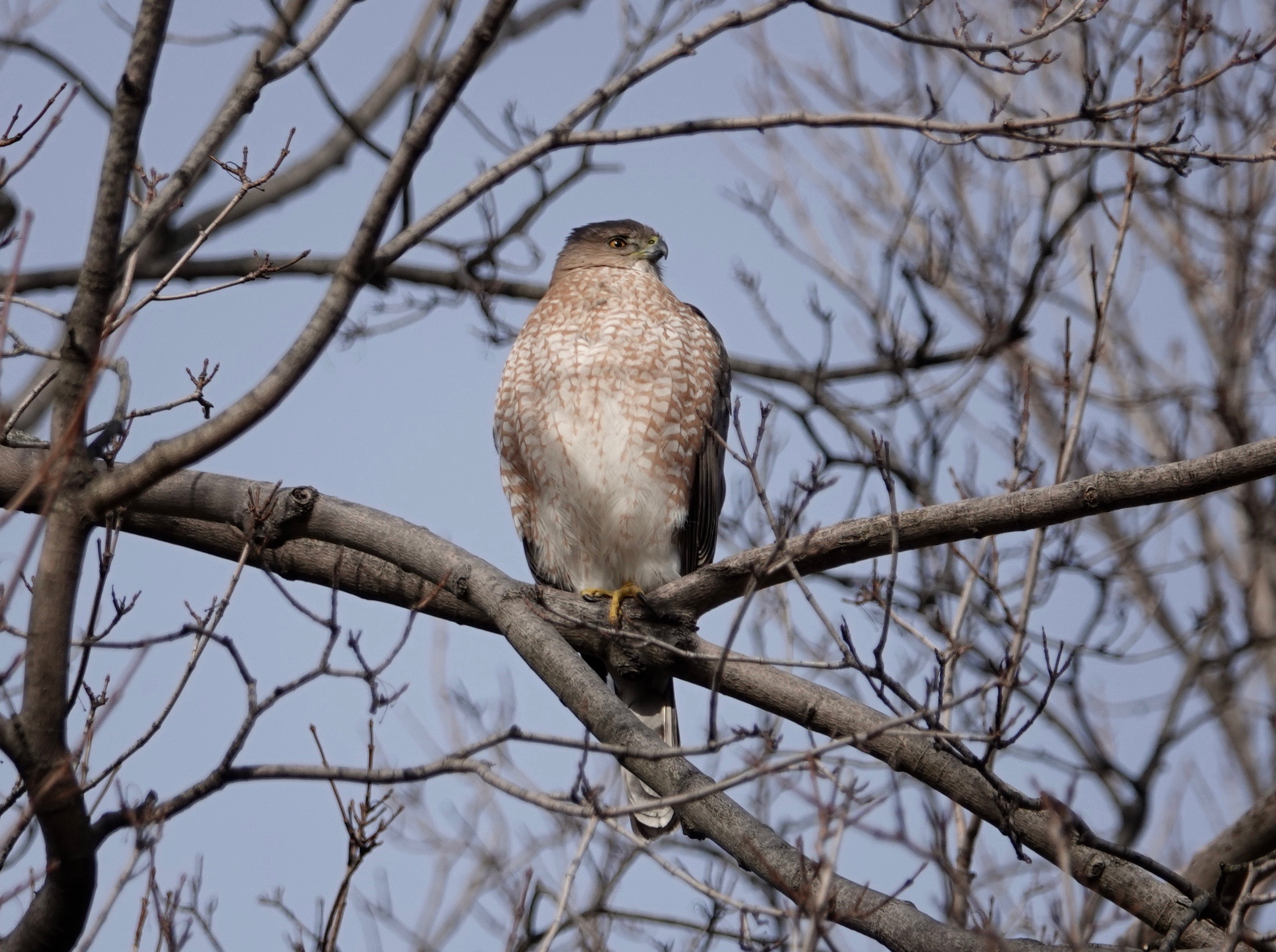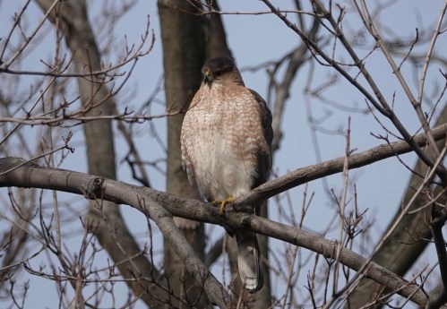 Of late, the Cooper Hawks I’ve seen have been in the air, as yesterday’s post, or huddling in the yews and arbor vitae. But this one was perching as bold as brass… or is that rusty iron? With nary a Blue Jay in sight…