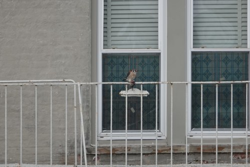 Kestrel on the same fire escape, with prey.