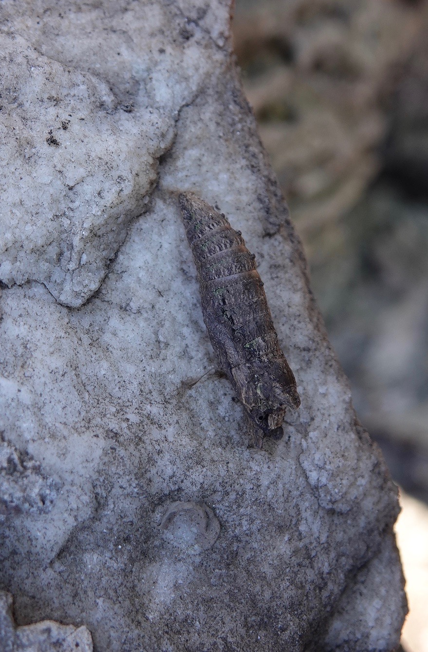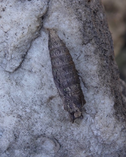 I saw this and the shape and size instantly put me in mind of a pupa. Then I had doubts. It is so incredibly twig-like! Yet the concentric rings, the firm binding at the top to the stone, and the secondary binding on the side, just a thin, flexible thread, were all there to convince me. Some searching on the internet revealed that it was probably a Tiger Swallowtail chrysalis. I submitted the pics to bugguide.net & iNaturalist for confirmation, but both have been non-committal as to species level.