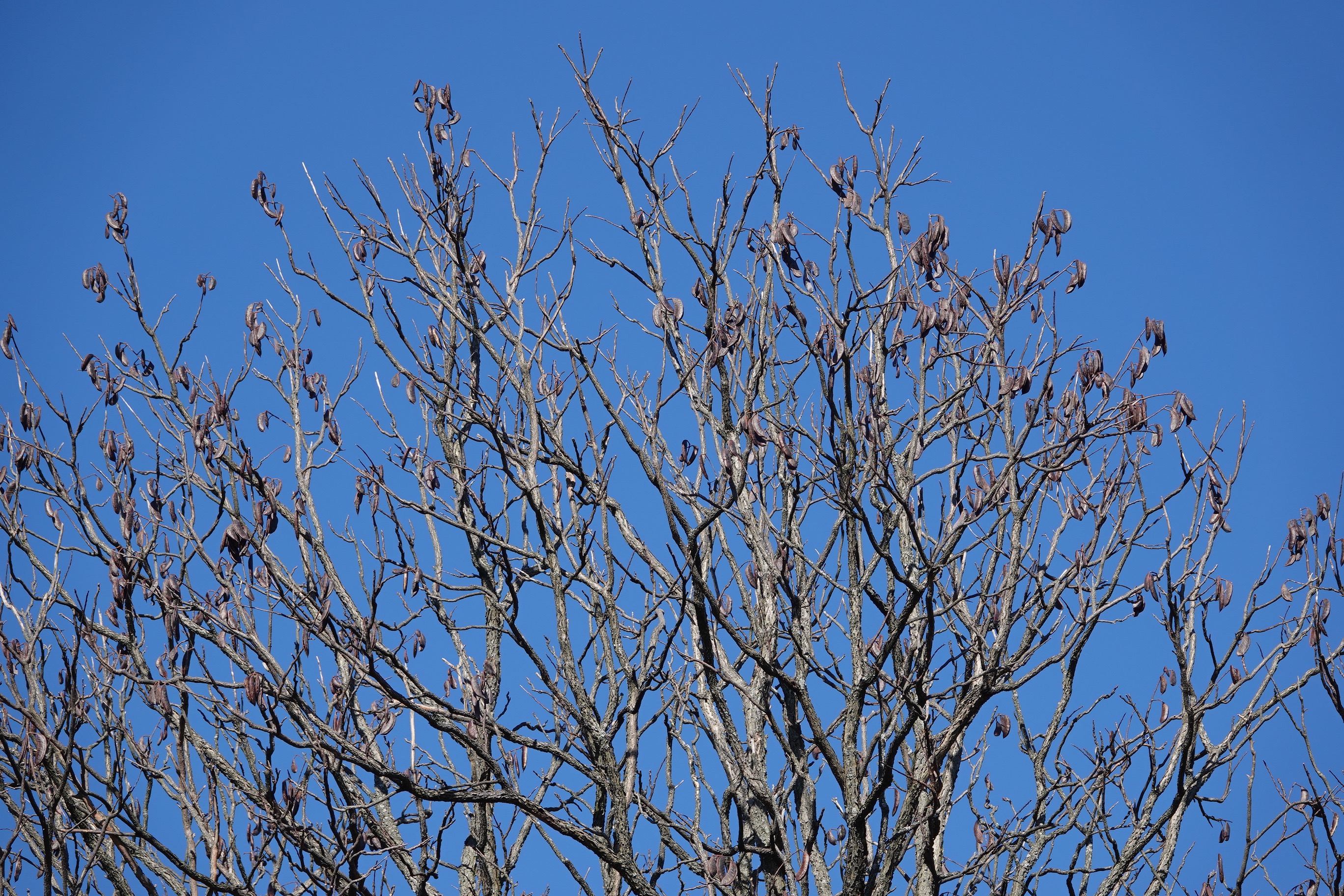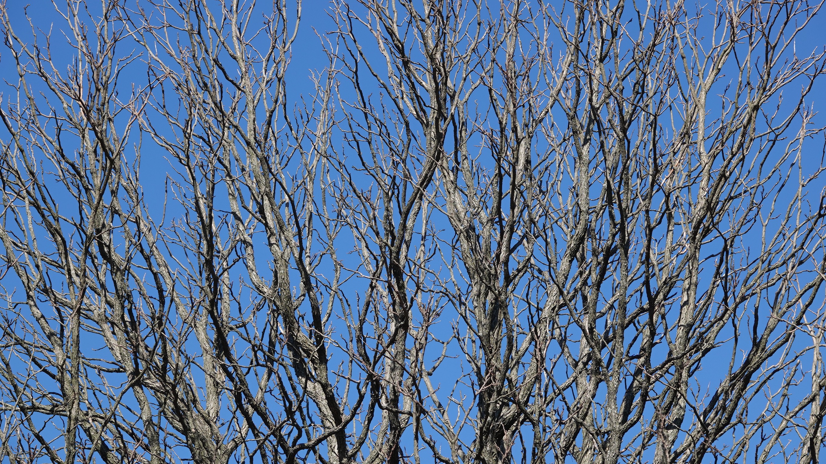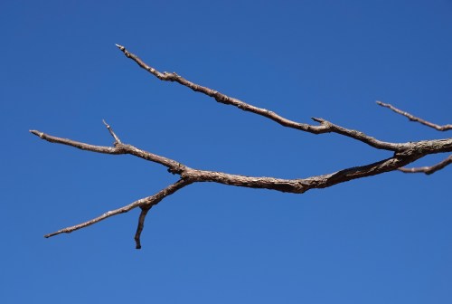 The branches look dead in winter, bare of twigs, the buds hidden away. The genus name translates as “naked branch.”