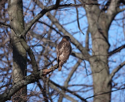 The ponds at Crescent-Dell are now brimming with bird-feeders, so there are song birds all over. RTHs general hunt mammals, but they will eat whatever they can catch. Only, being so big, they are not the most agile or subtle of hunters, like falcons or Accipiters, who are more commonly bird-eaters.