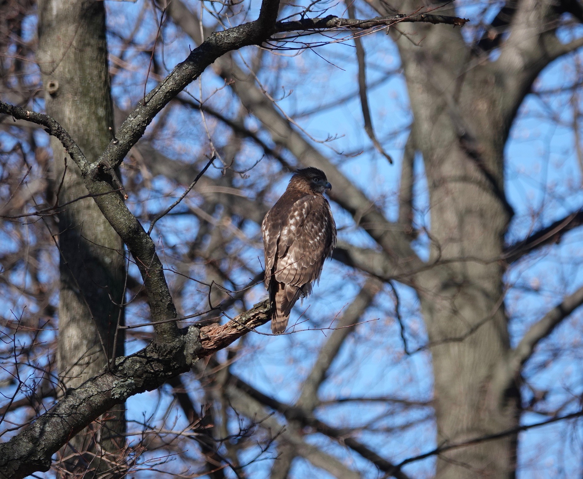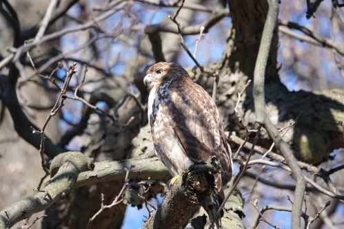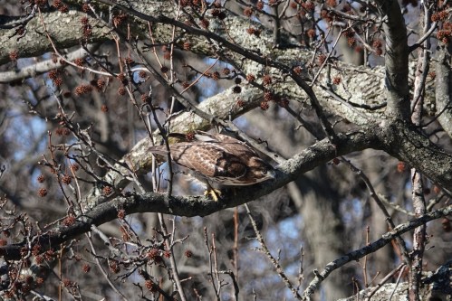 The ponds at Crescent-Dell are now brimming with bird-feeders, so there are song birds all over. RTHs general hunt mammals, but they will eat whatever they can catch. Only, being so big, they are not the most agile or subtle of hunters, like falcons or Accipiters, who are more commonly bird-eaters.