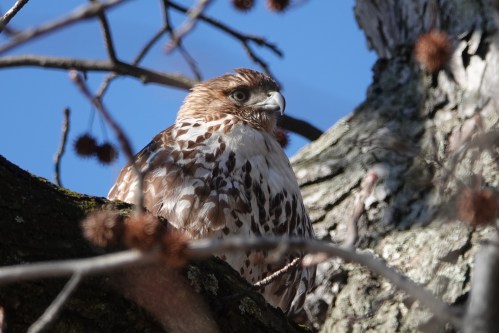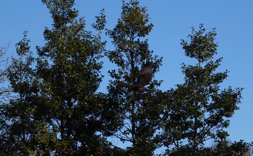 A young Red-tailed launches into the air in pursuit of… a Canada Goose? No, really? Yes, really. There were a dozen geese herding up the hill above Crescent Water in Green-Wood. The hawk raised a gaggle and disappeared from my sight. Then it flew back to this tree, making another pass of the geese as it did so. After this, the hawk gave up on that idea, and flew the other way towards a trio of holly trees brimming with fruit and a big flock of American Robins.