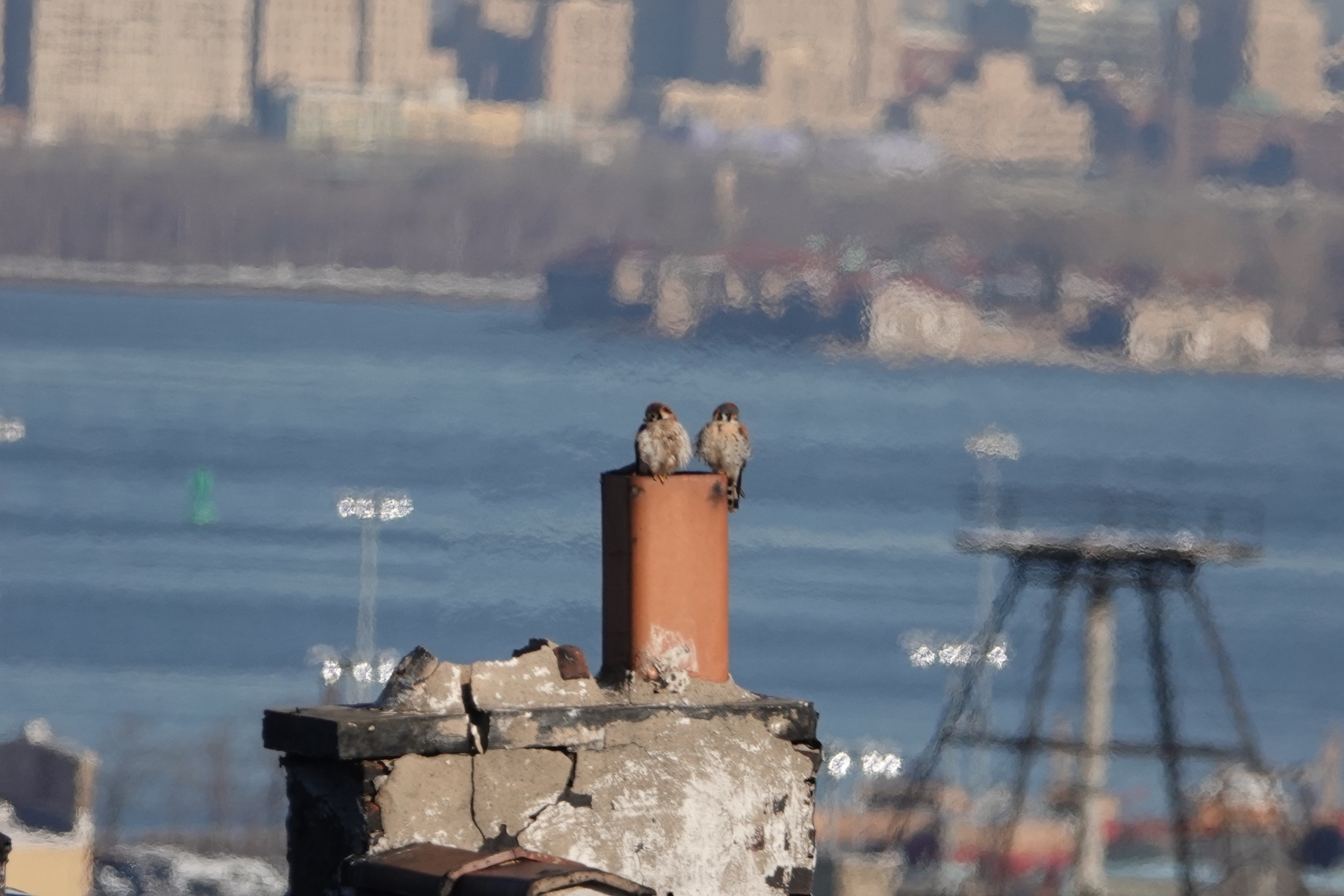 A big change from last year’s #BrooklynKestrels story is that the upright dead limb of the London plane tree across the street is no more. It was a regular perch for the falcons. It came down in a snowstorm this past November. Also this year, there’s no sidewalk shed around around our building: this hosted several House Sparrow nests last year, which probably meant the population of this Kestrel prey species was enriched.