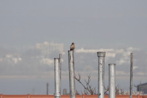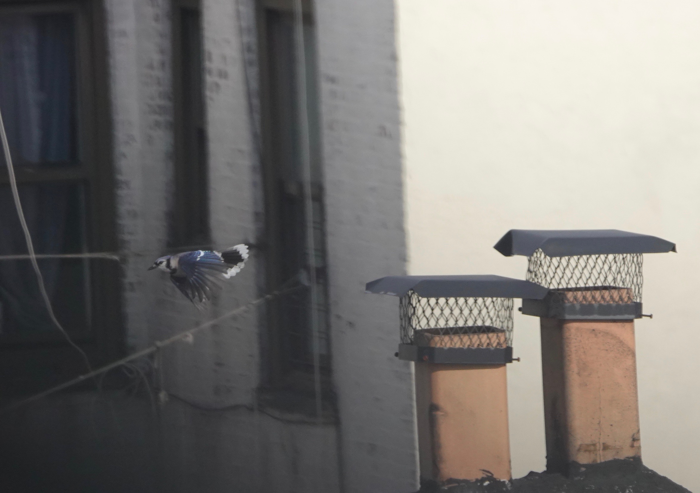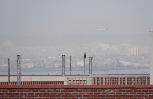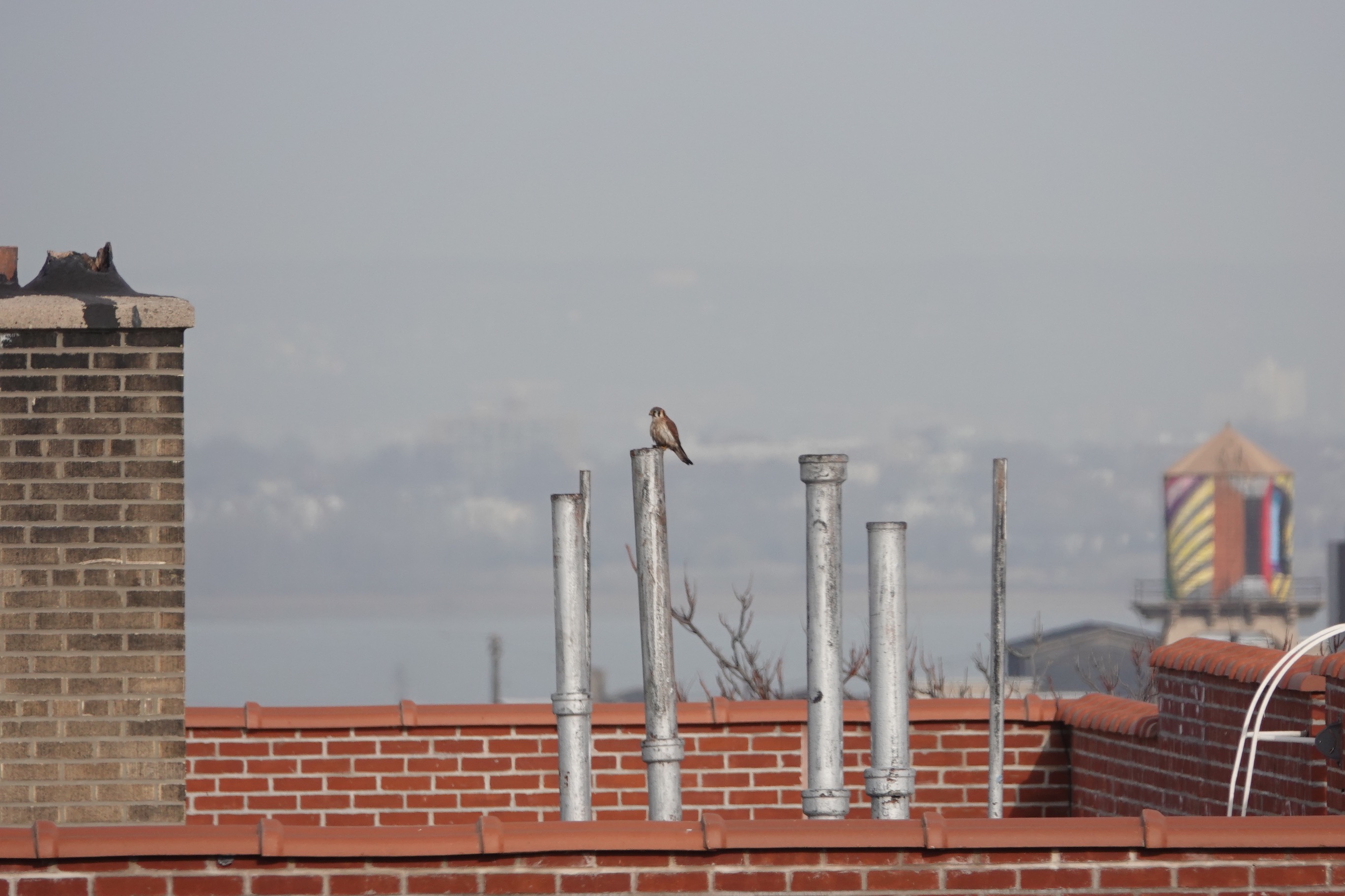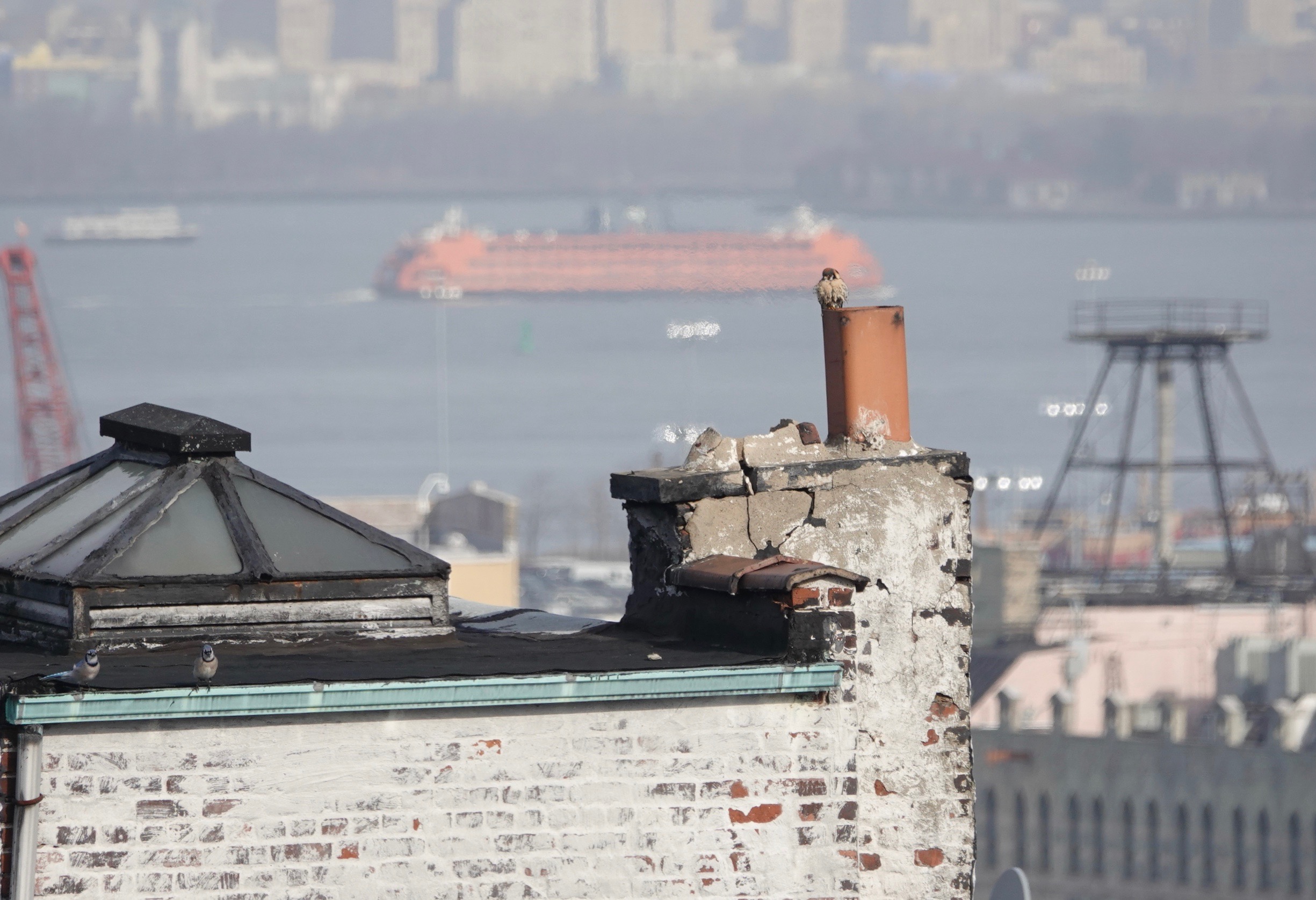 The female showed up. She perched on one pipe of a neighboring building, flew to a another pipe on the other side of the same building, and hey!