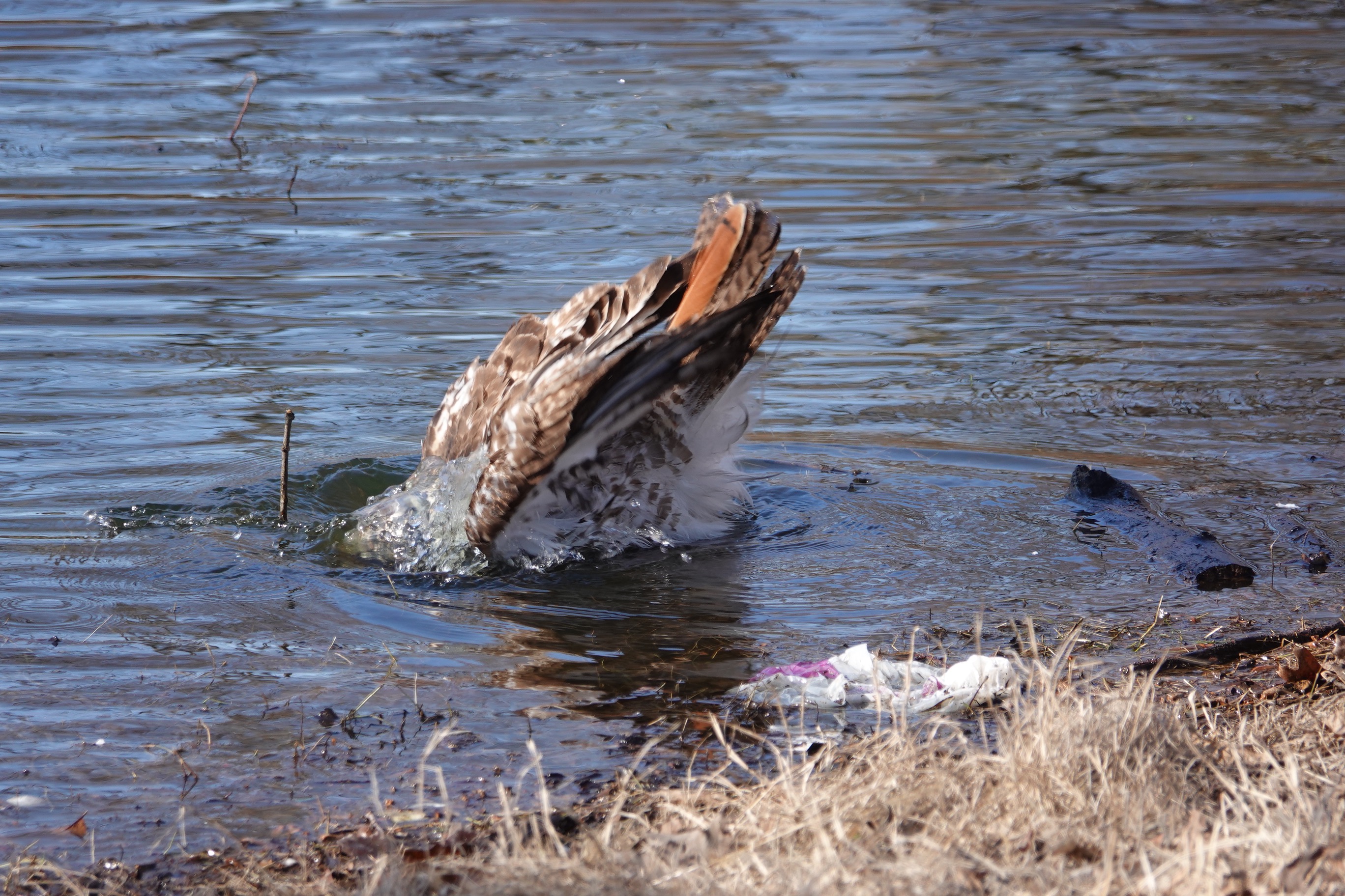 This Red-tailed Hawk has a single red tail feather. The bird is less than a year old, and with luck will celebrate its birthday this summer. Right now, it’s maturing, a process that includes losing its old tail feathers and growing new and rather different ones. By its first birthday, it should have the full complement of these rufous tail feathers, source of the species’ common name. For obvious reasons, molting — the transitional replacement of feathers throughout the year — can’t all happen at once.