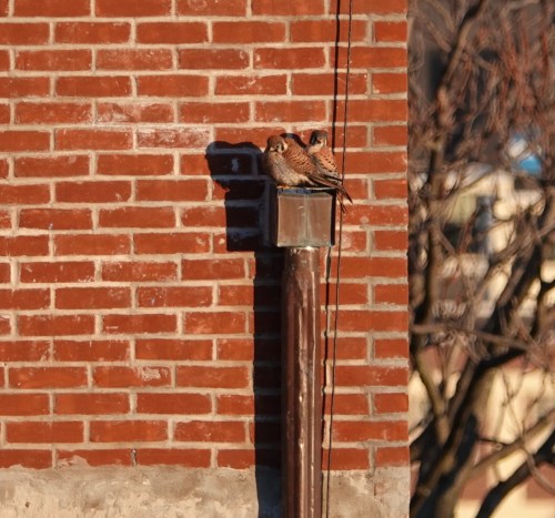 When it’s cold and windy, the pair huddles on this drainpipe housing. (They did this last year, too.) Here they’re out of the wind and get the full force of the morning sun. You can see how much bigger the female is in comparison to the male. They’re usually active at sunrise — we’ll hear them before seeing them. They’re spending a lot of time on a TV antenna across the street, but it’s behind a London Plane tree so the view is awful. We spot them sporadically during the day. They usually hang out together around sunset, although it looks like they both go separate ways for roosting. The female should be taking to the nest cavity soon.