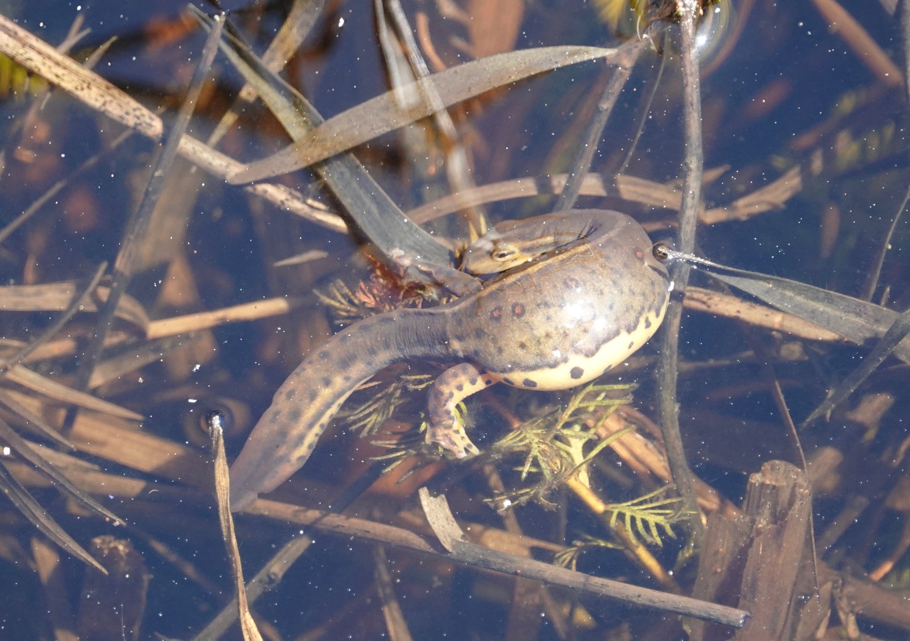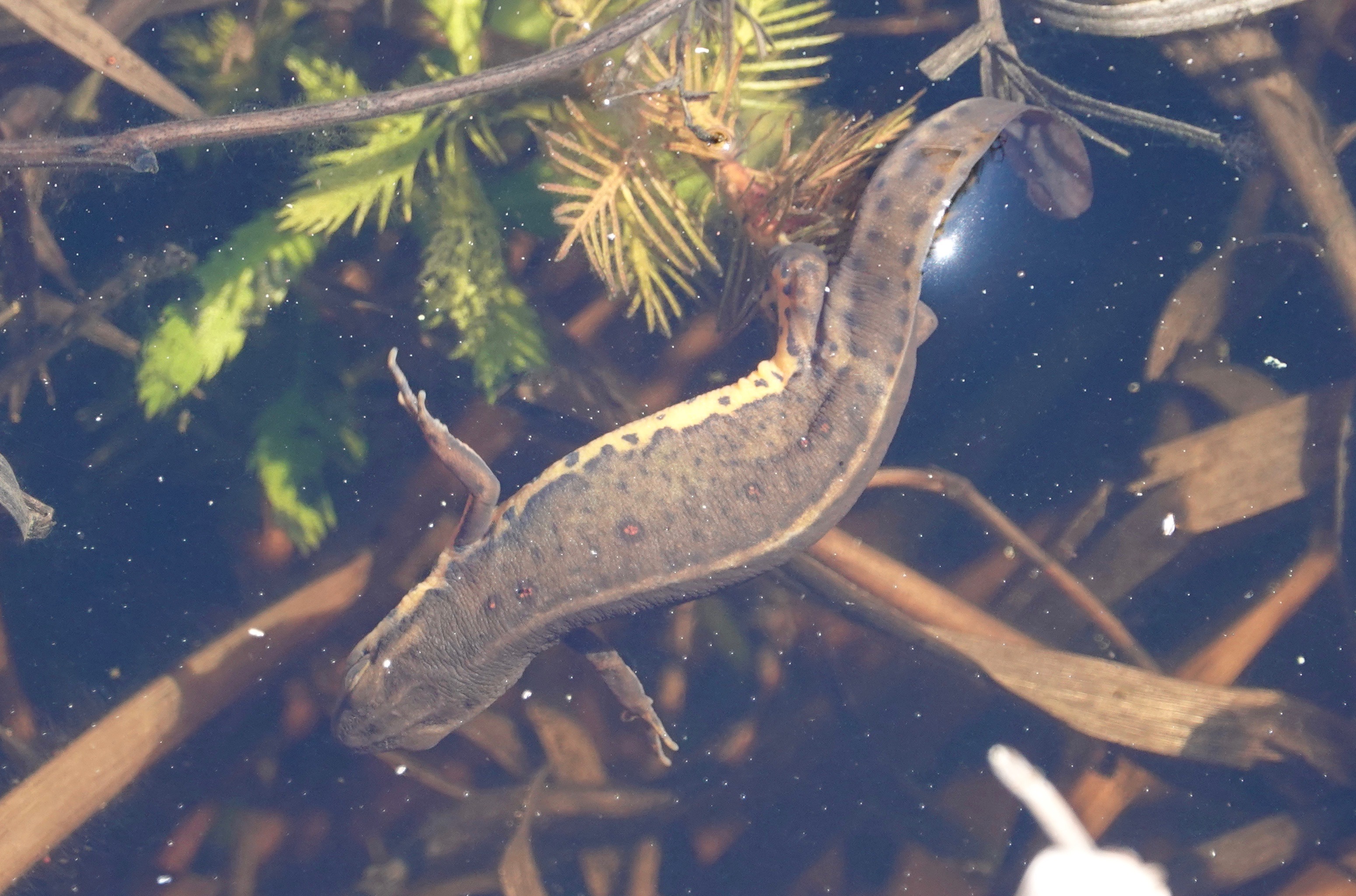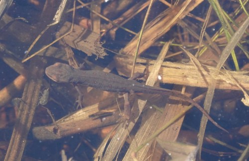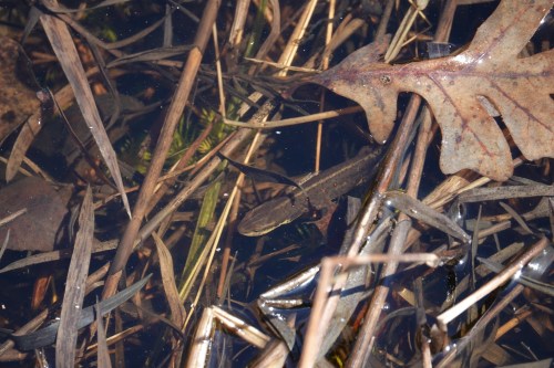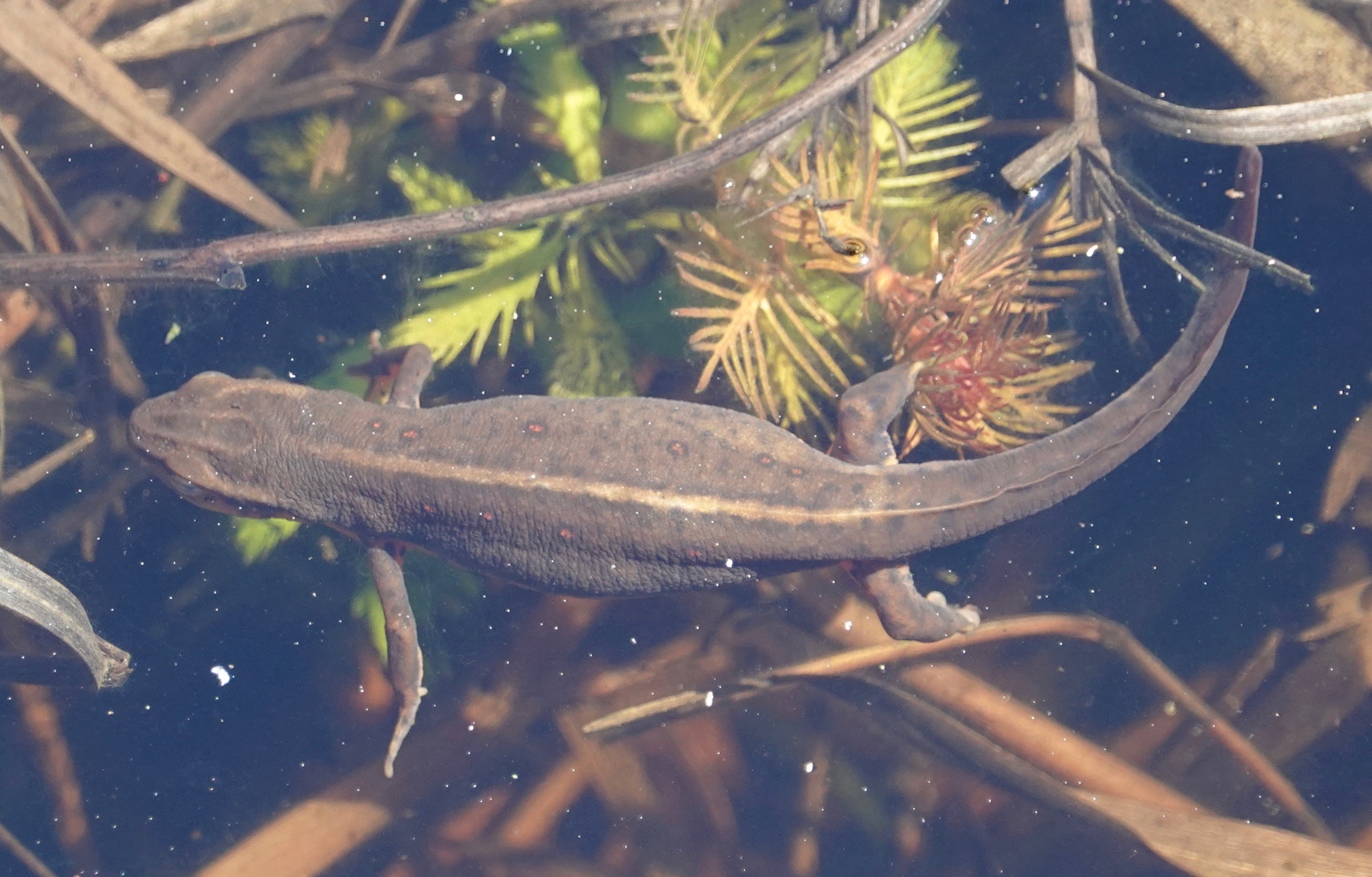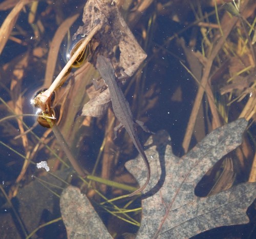 When they’re younger, they have a terrestrial stage. On land, the “red efts” are startlingly orange-red colored, walking “don’t eat me!” signs (being toxic to most predators). These spotted newts can live more than a dozen years.