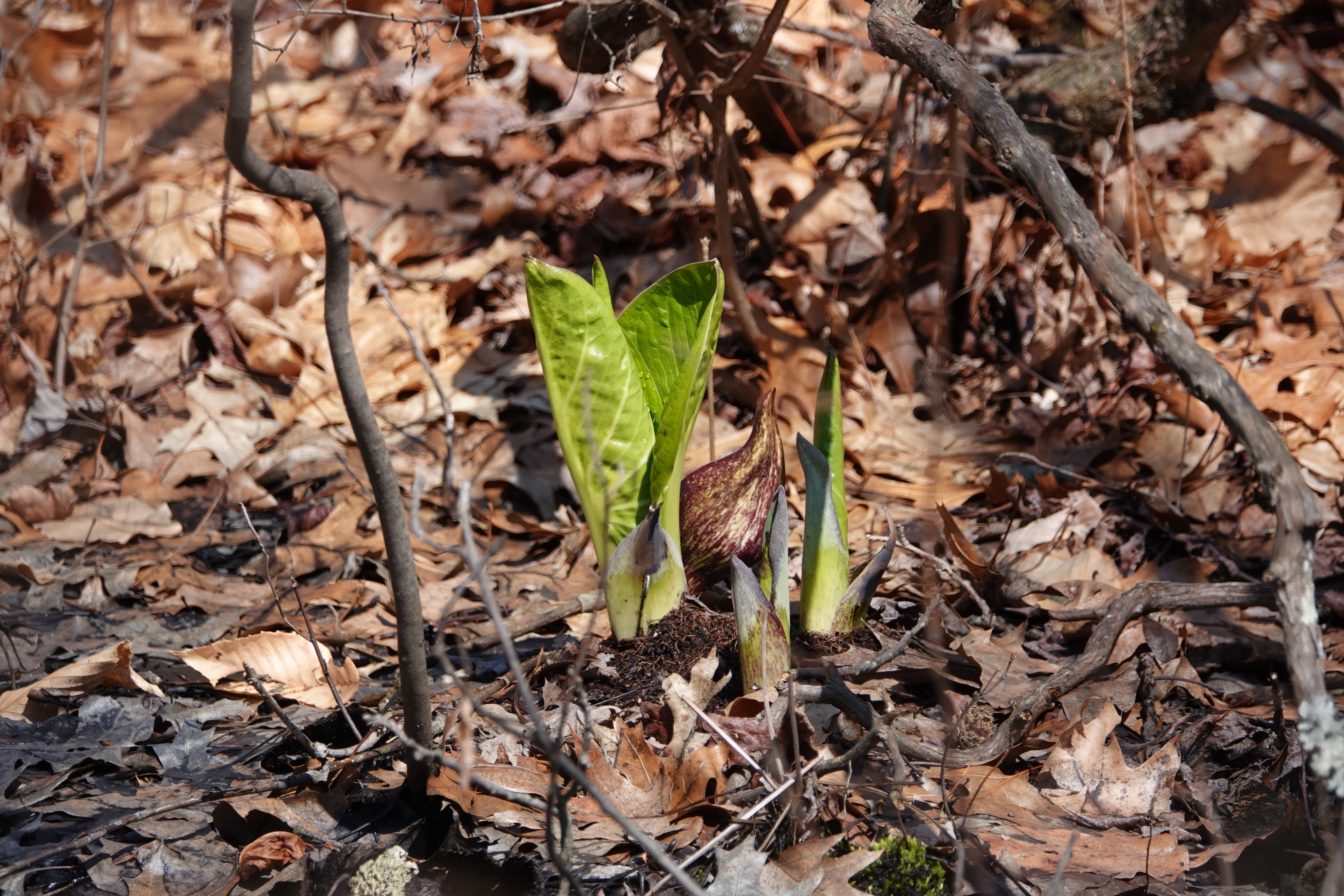 Some skunk cabbage, so called because of the smell, which attracts flies. Flies being some of the earliest pollinators in spring. The mottled curvilinear part is the spathe, a sheath-like bract that encloses the spadix. Unfortunately off the path, so couldn’t get closer.