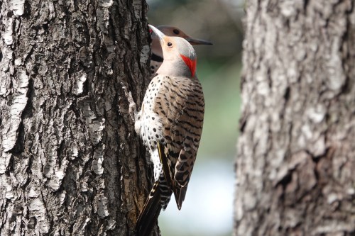 These two were doing a more typical woodpeckery thing on the arboreal verticals. Note, especially in the first image, the tail feathers pressed down against the bark. Woodpeckers have stiffer tail feathers than perching birds.