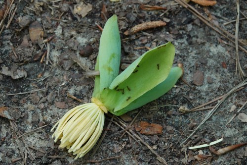 The smell of the flowers of Liriodendron tulipifera incites reveries in my smell-brain. Where do I know that smell from? The ants, too, are intrigued. Wonder what they think when they fall out of the sky?