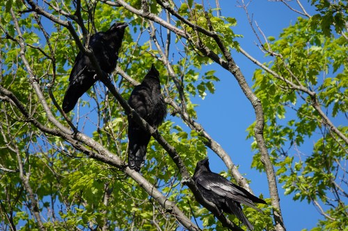 Four Common Grackles chase a Common Raven near Green-Wood Cemetery’s neo-gothic entrance. The Grackles nest in pines in this area. As soon as this Raven was escorted off-site, I turned around to see another of the huge corvids further in the cemetery. Then, I heard them.