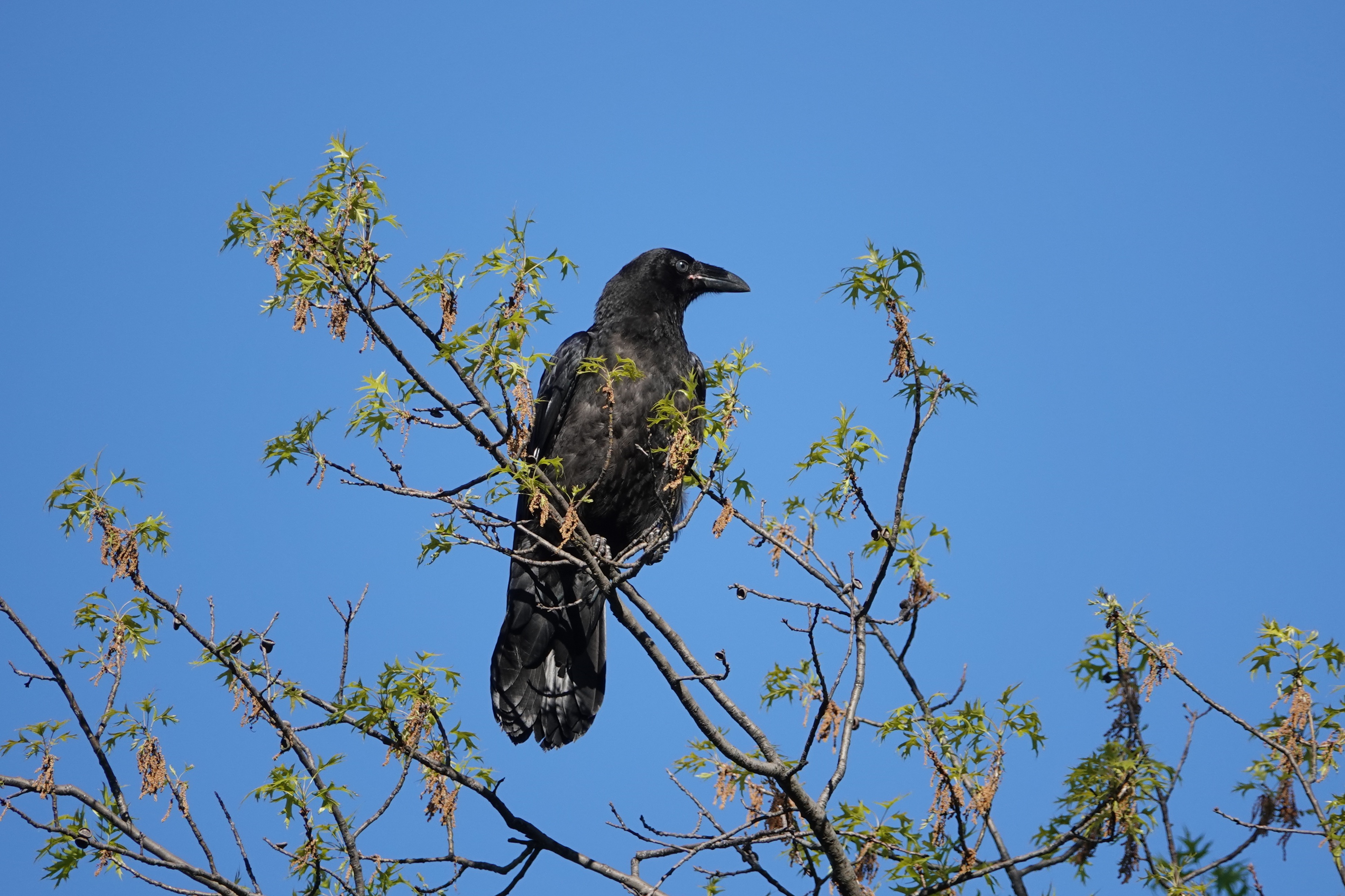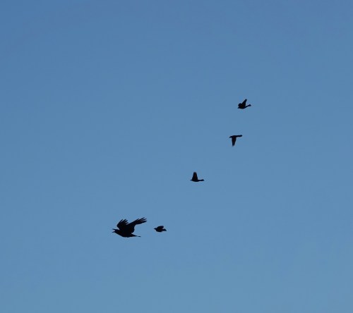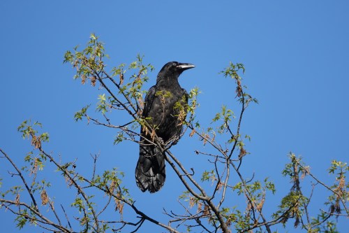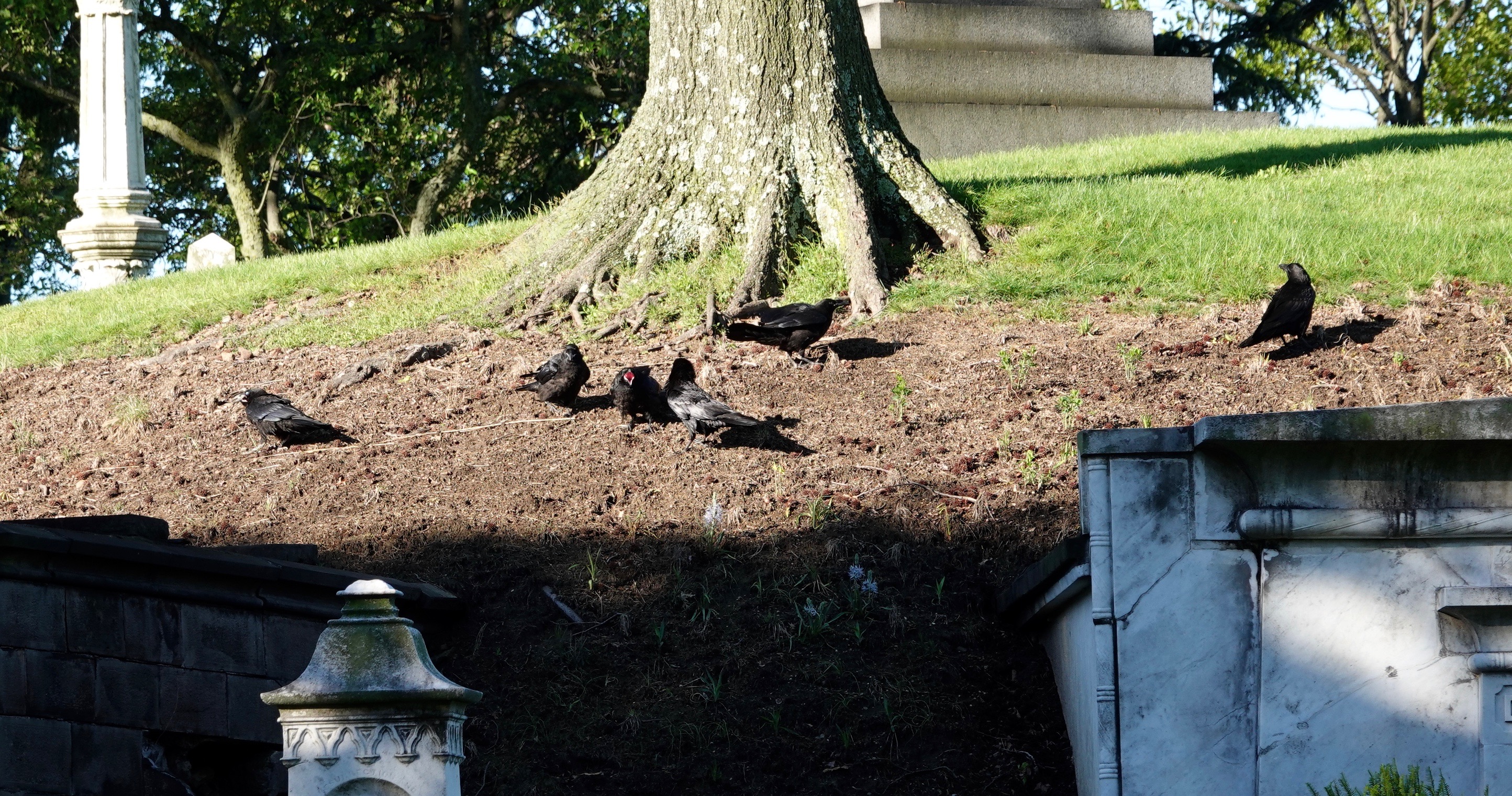 Four Common Grackles chase a Common Raven near Green-Wood Cemetery’s neo-gothic entrance. The Grackles nest in pines in this area. As soon as this Raven was escorted off-site, I turned around to see another of the huge corvids further in the cemetery. Then, I heard them.