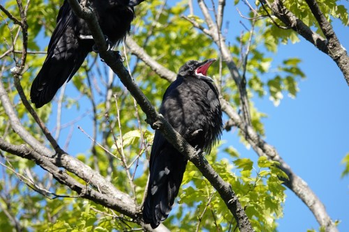 You may have learned (in corvid school?) that a pinkish-red mouth indicates a young Raven. Mature birds have black mouths. But this is slightly less clear-cut then it sounds.