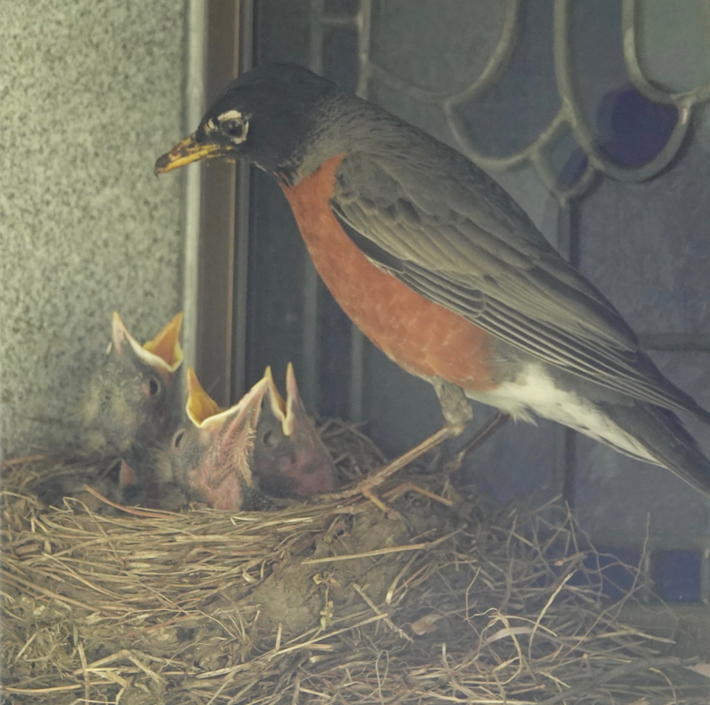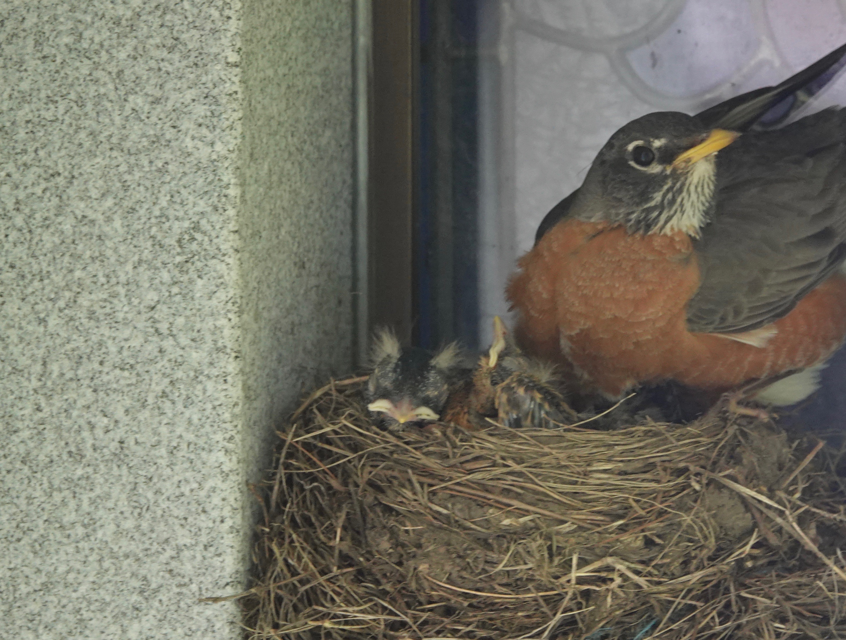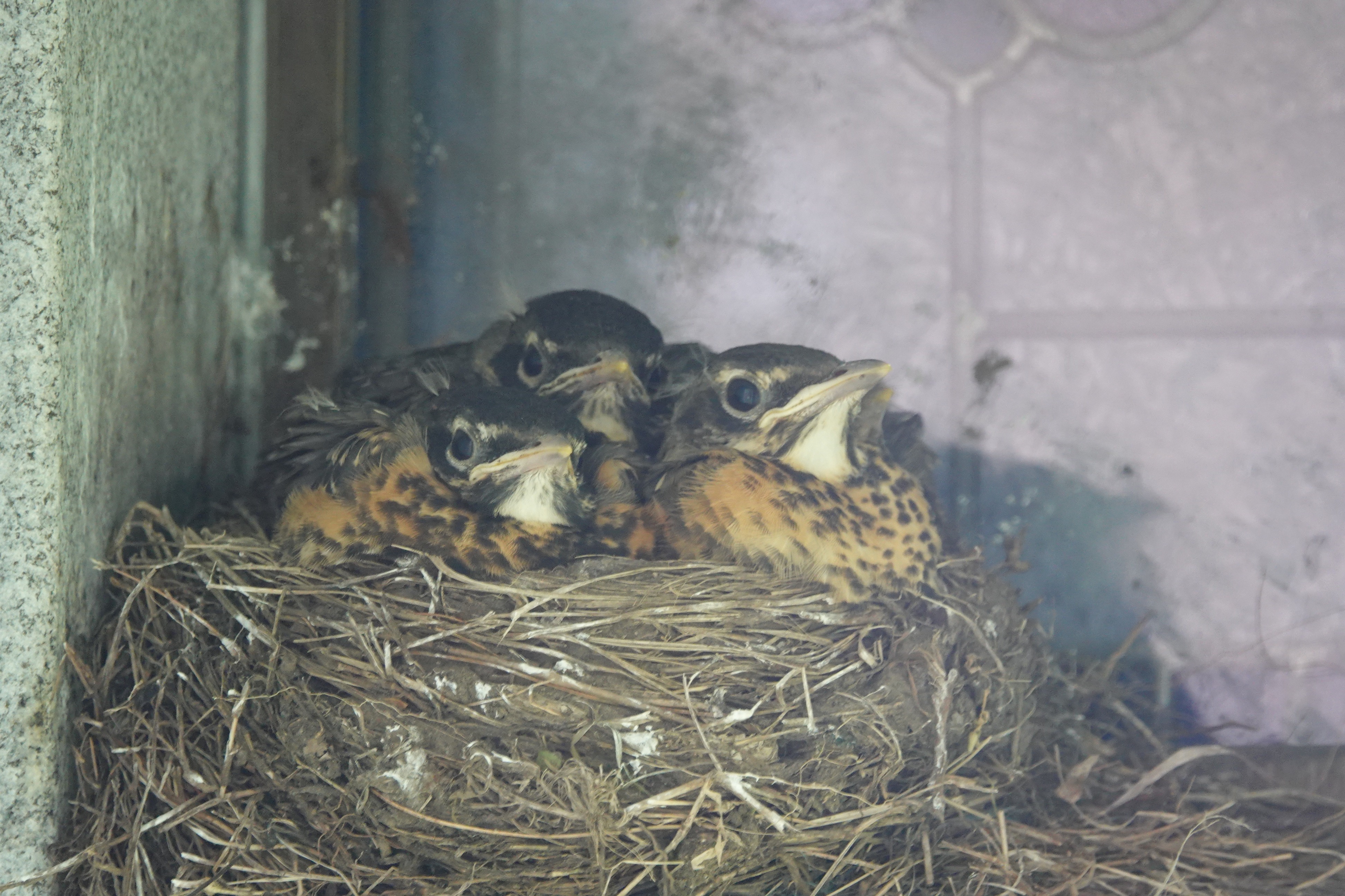 On May 16, the nest was empty. Young American Robins leave the nest before they can fly. People sometimes find them and think they’ve fallen out and need help. But they are fine. Unless the cat is out, in which case put the cat back inside and don’t let it out again. The wee Robins on the ground are still being cared for and fed by their parents.