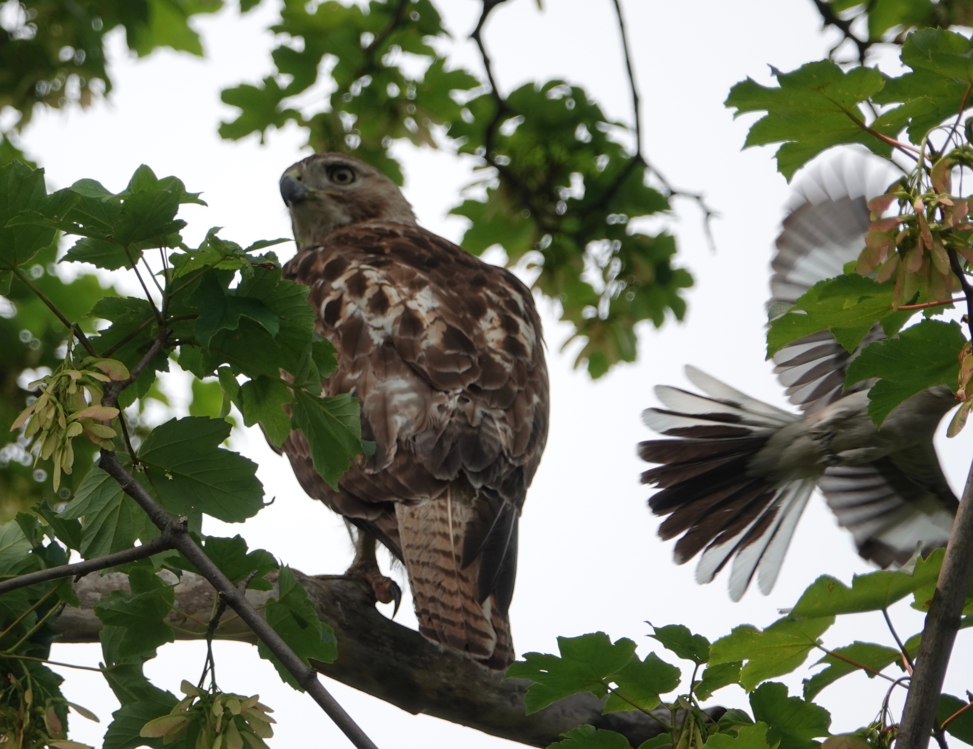 What a racket! Twice recently I’ve come across a storm of American Robins sounding their strident chip alarms. A perching Red-tailed Hawk was the source of the commotion both times. In this second case, a buzzing Northern Mockingbird was in on it, too, repeatedly razzing, sometimes even clipping, the big raptor. When the hawk flew out, the Mockingbird stayed with it around the Sylvan Water.our