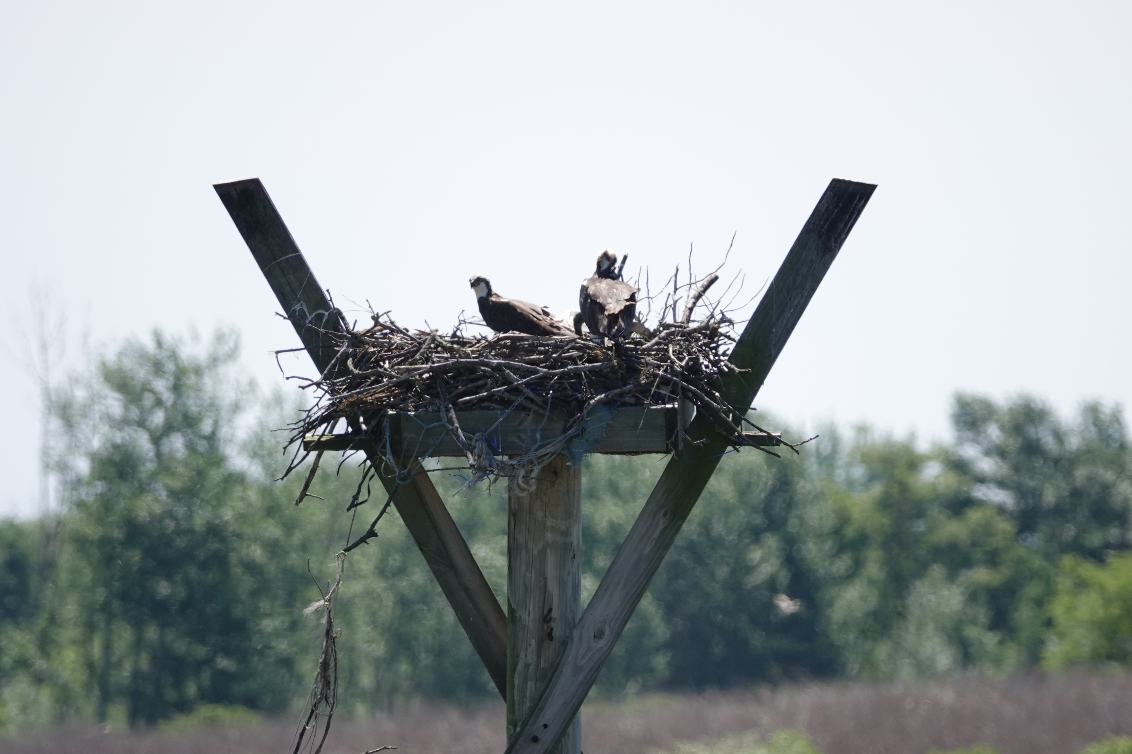 Out at the Salt Marsh, at least two heads of baby Osprey were seen here recently. One can be seen between the two adults. Looking much a mini Loch Ness monster.