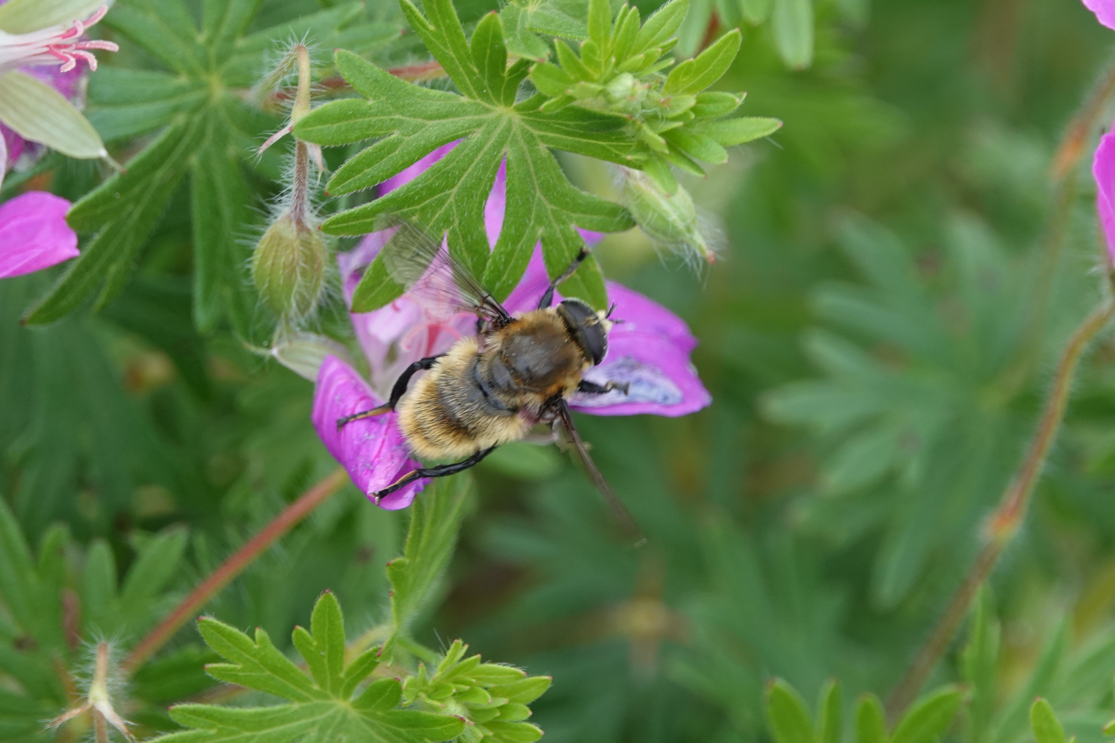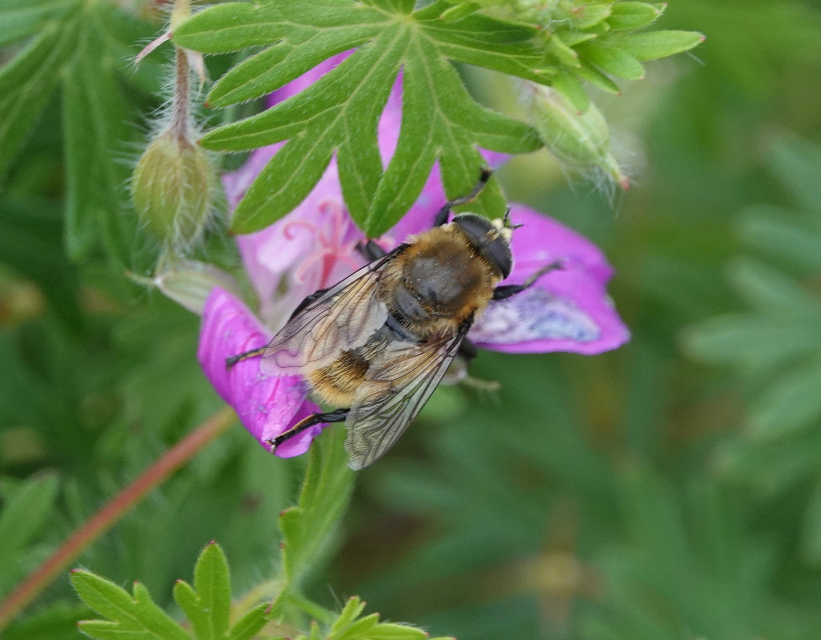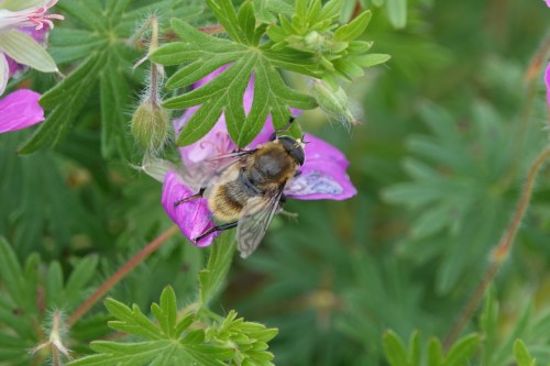 But, taking it from the top, the characteristic eyes of a fly let us know that this is a bee-mimicking fly. In addition, the two wings literally point to Diptera, the order of flies, named after their two wings. Bees have four wings (paired, they can be hard to separate by eye).