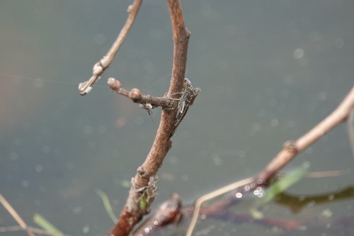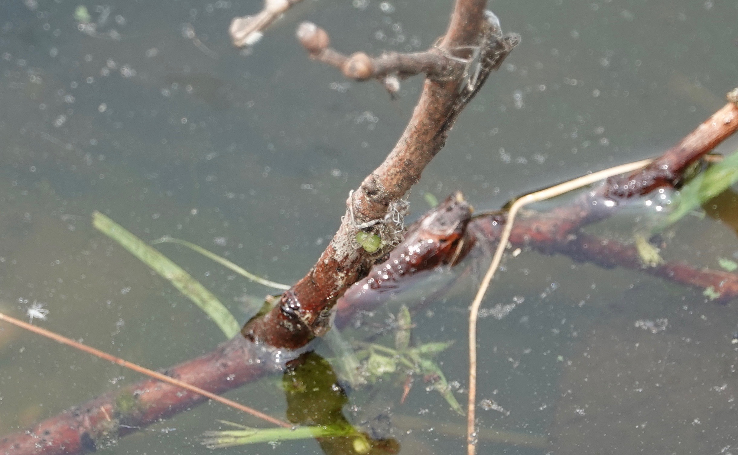 There are two damselfly nymph husks on this vertical twig. After hatching, damselfly larva become fierce little aquatic predators. They molt as they grow underwater. Given the date these were spotted, early June, these must have overwintered in Sylvan Water before emerging on a warm day to break out as the adult, flying form.
