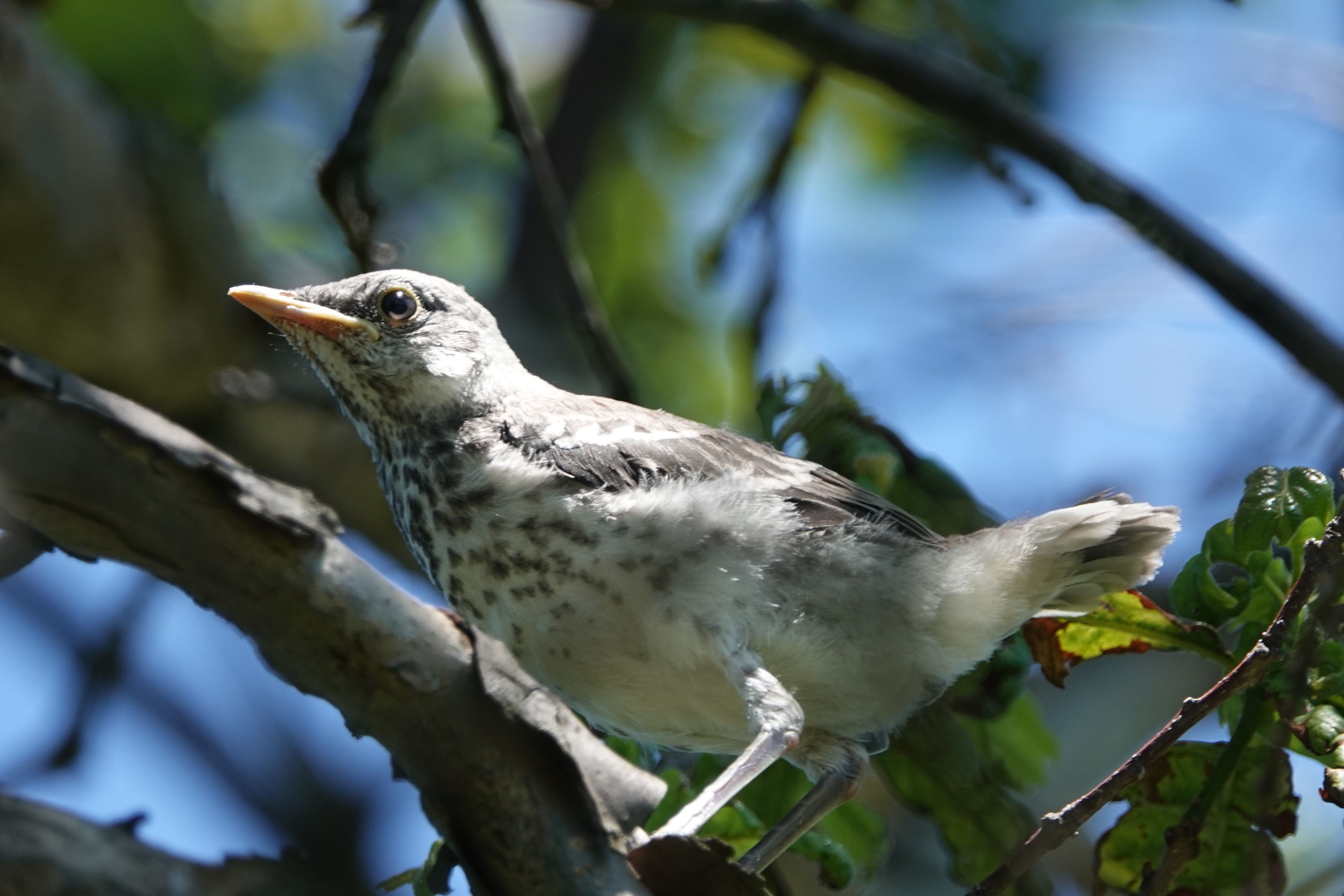 A fledgling Mockingbird in a tree. These things give themselves away with their “feed me” chipping.