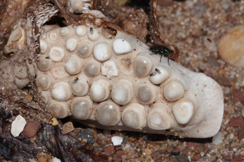 The beach was littered with dead filleted fish, fish heads, and two big, rotting corpses. I think these latter were Sheepsheads. This is the lower jaw of one them. Yes, they have teeth! Too bad they don’t crunch up their killers, right?