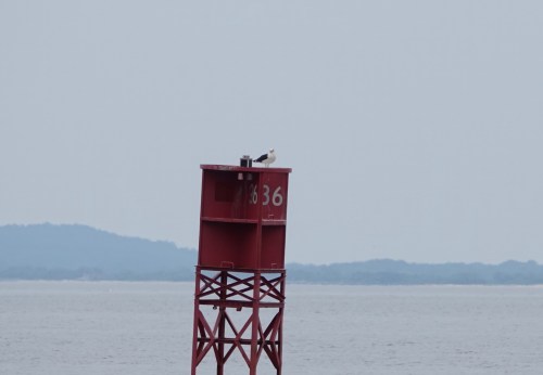 One of the Raritan Bay channel markers (“red-right-return” to the sailors) had an even bigger gull on it. Indeed, the world’s biggest: a Greater Black-backed Gull, who made a sortie after a fish-laden Osprey. The Osprey held firm.