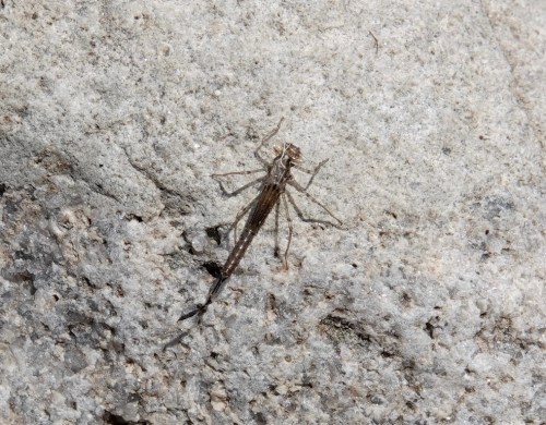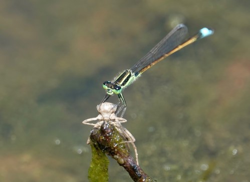 Wait… what? This Rambur’s Forktail damselfly is perched on the exuviae of a dragonfly.