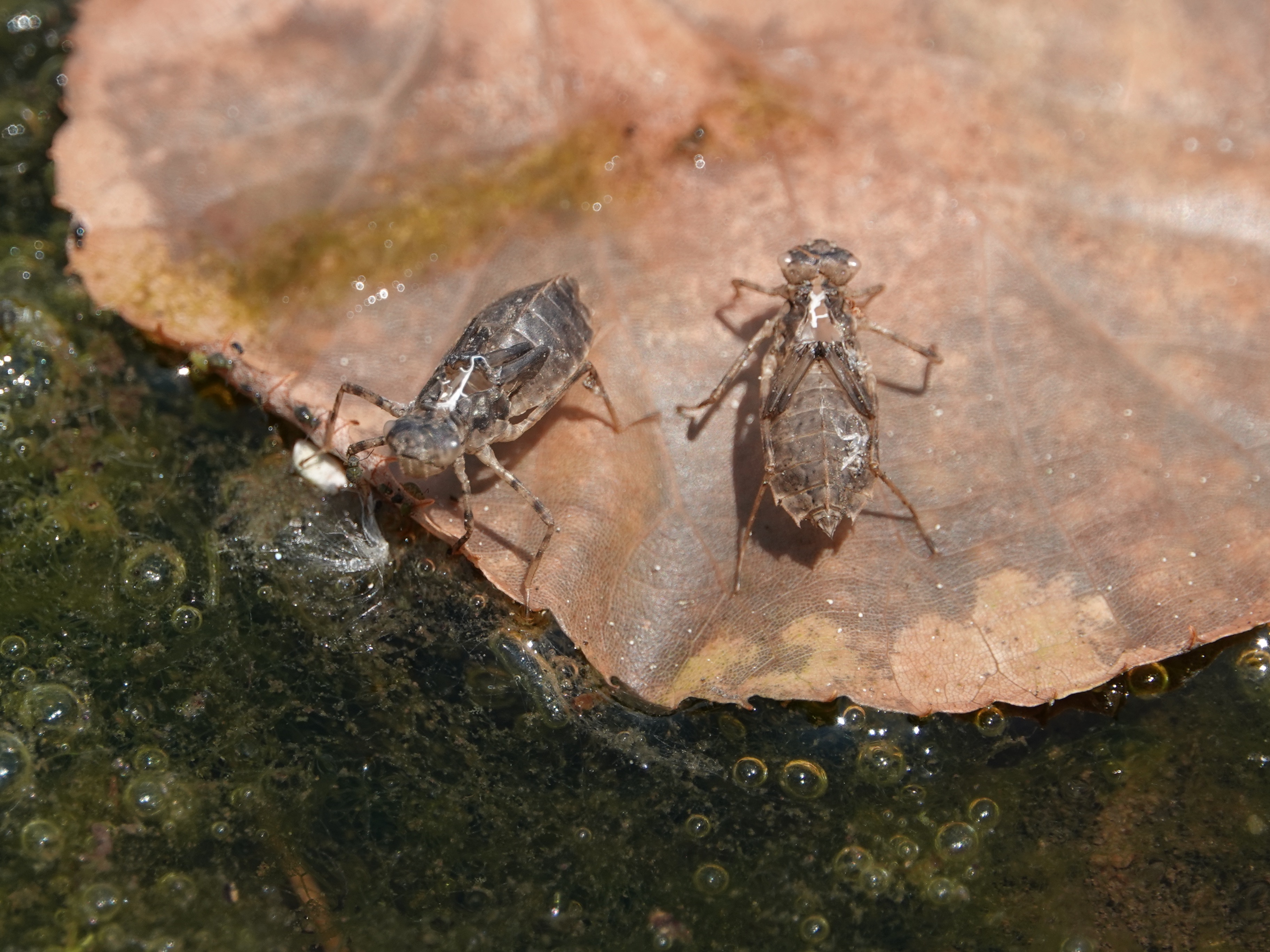 A floating leaf in this case. The adults emerge from these, with wings! The remaining husks of exosleton are called exuviae. These were left by dragonflies: the short wing-like gill structures on the back tell you this.