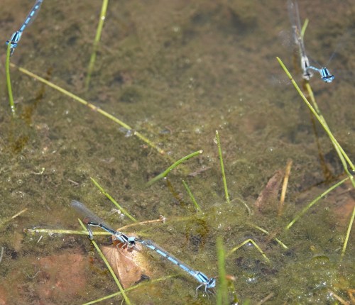 Another view of the male Rambur’s green-blue color pattern. Dragon- and damselfly eggs are laid on or near water. The larval stage is aquatic. After a season, or a year (or more depending on species and location), the aquatic nymph crawls out of the water, onto a twig, stone, etc.