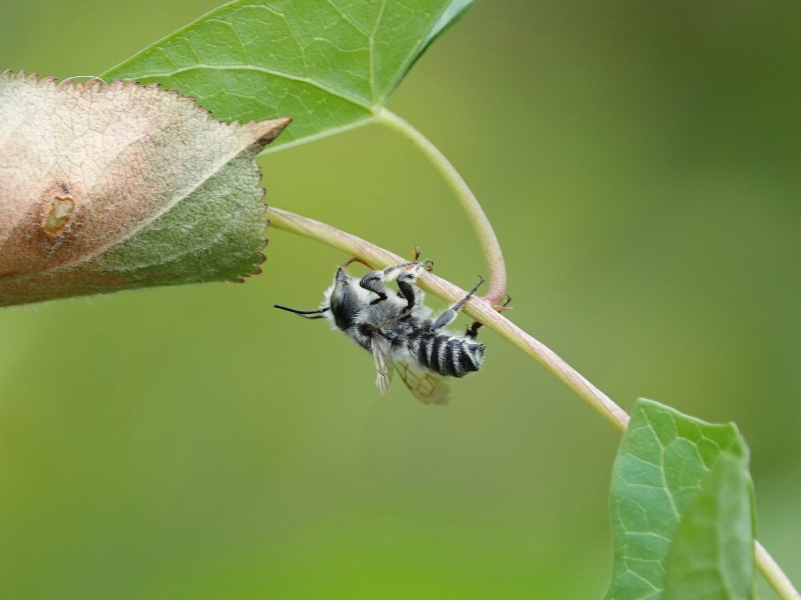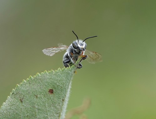 This one explored numerous leaf edges. The tip of her tongue looks very rough… it’s hairy. I guess she’s looking for the right leaf to cut? She uses these pieces of leaf to line her nest. This Univ. of Florida site gives good information on leaf-cutters, but then says “Leafcutting bees can be considered a pest because of leaf cutting on ornamental plants.” No, no, no! Isn’t this infuriating? It’s nineteenth century gardening nonsense in the 21st century. Human aesthetics, another thing killing the planet.