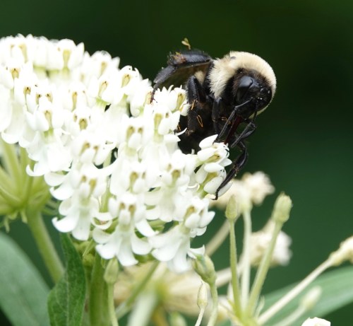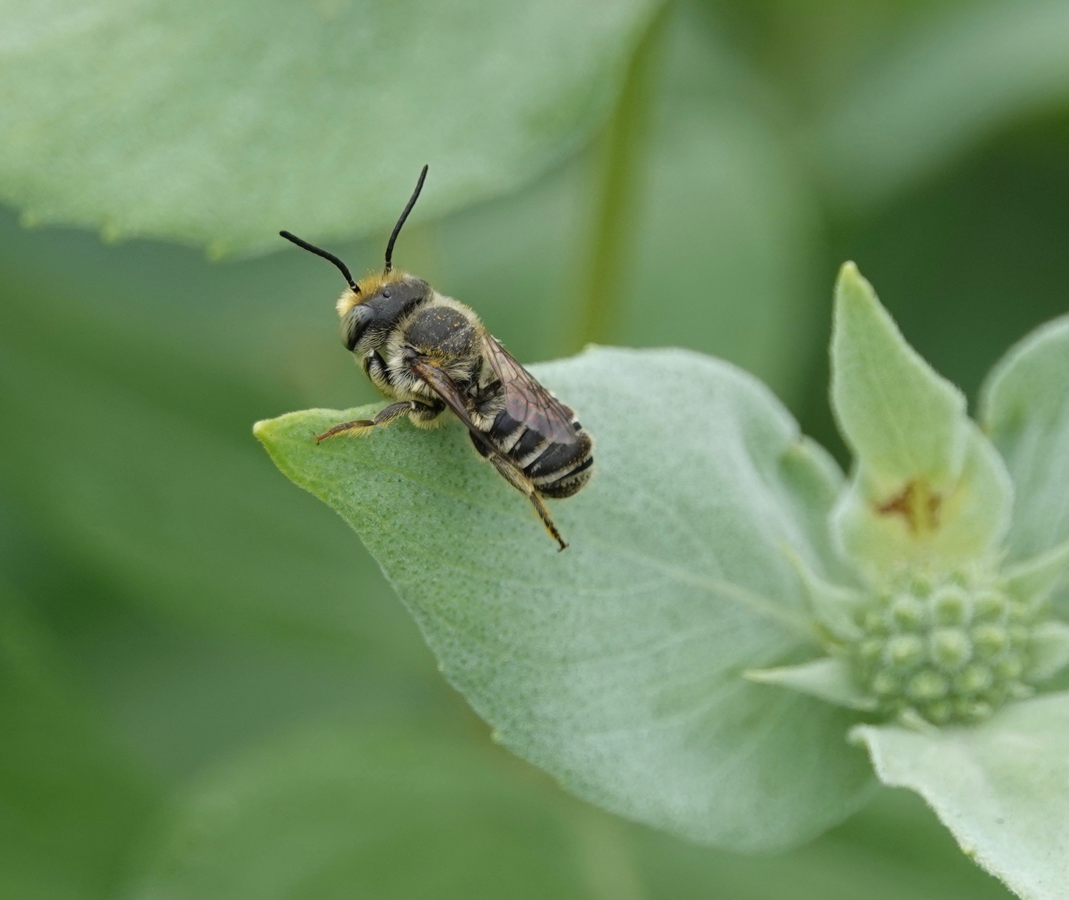 Check out the tongue between the down-turned antennae. (Those antennae, by the way, are hugely important sensory organs: they can touch, taste, and smell.) There are short-tongued and long-tongued bee species.