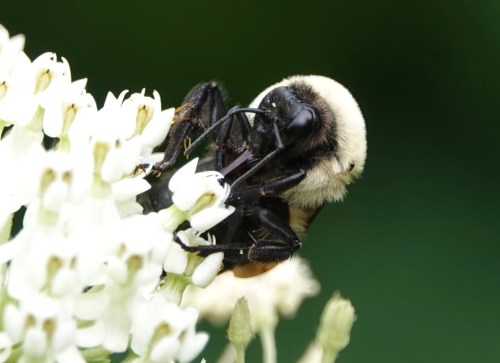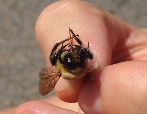 This poor Bombus didn’t make it. She died with tongue out (unless it’s a male?). With some magnification, the tip of the tongue is seen in all its roughness. The flanking parts are mouth bits, maxilla perhaps, or palpi?
