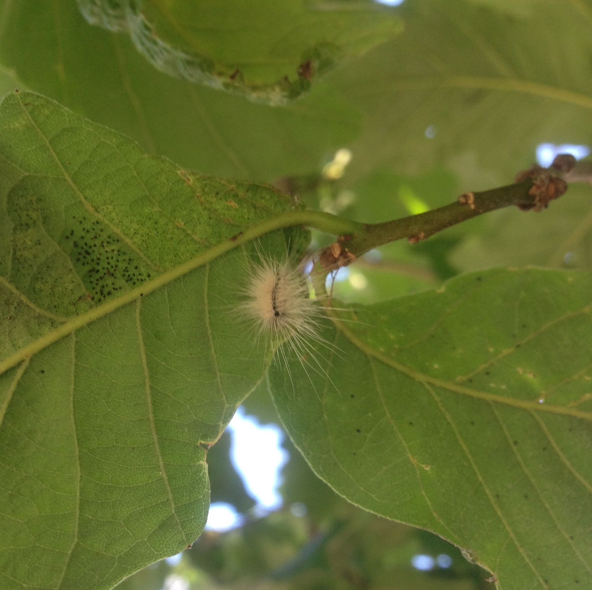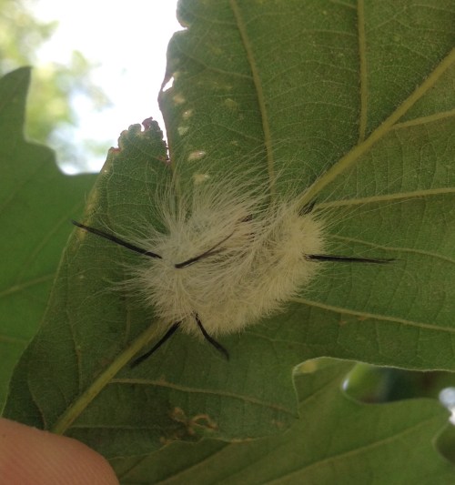 There’s a row of Swamp White (Quercus bicolor) and Pin (Q. palustris) lining a street nearby. I look up into them when I pass. The trees are young enough that the leaves are still within reach. Flies, ladybugs, aphids, galls can all be seen in the trees. This is recent sighting: the caterpillar of the American Dagger moth (Acronicta americana). They can be rather yellower as they grow.
