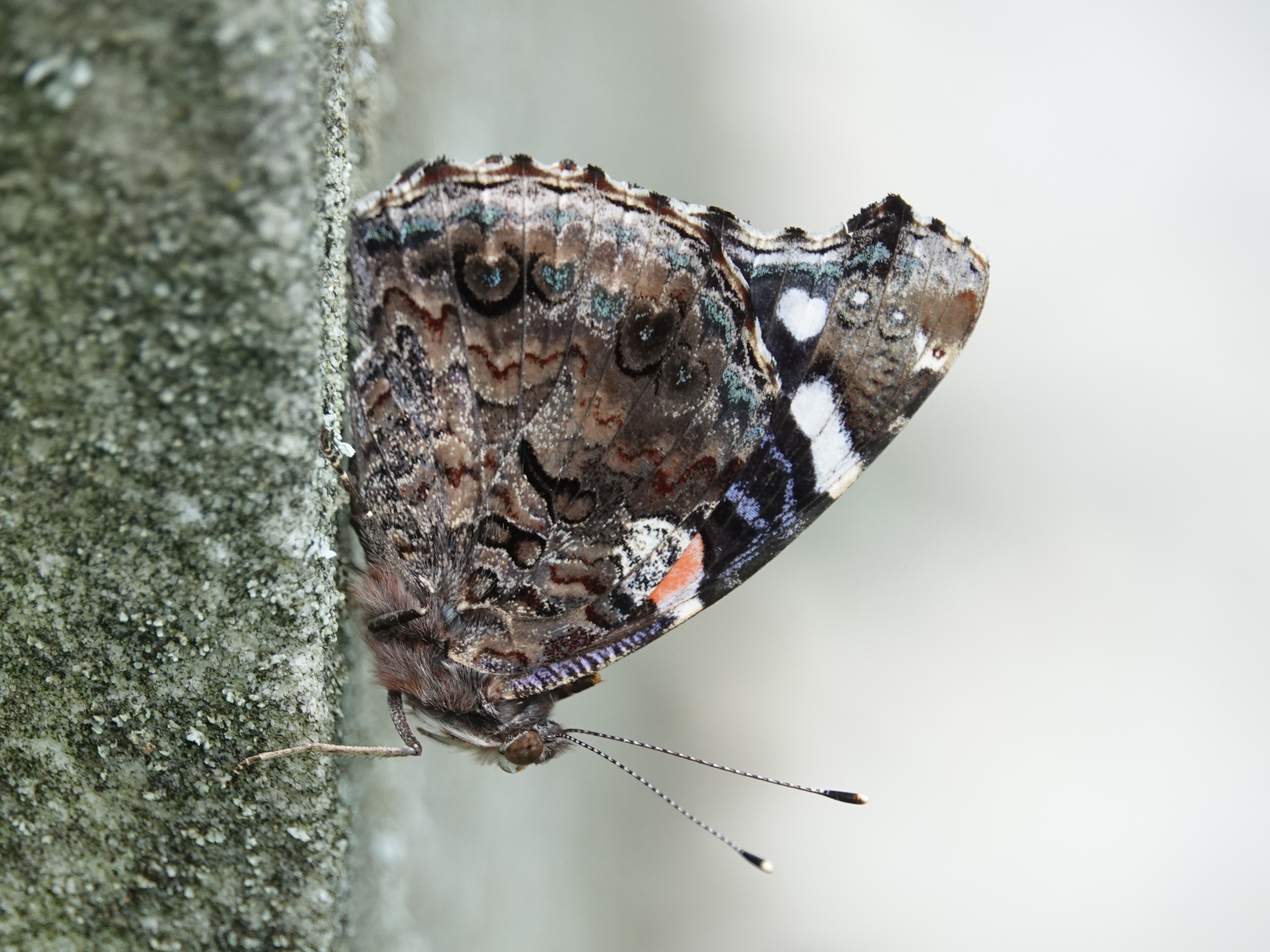 Red Admiral, very beat up. Note the rolled tongue: it has to go somewhere while in flight.