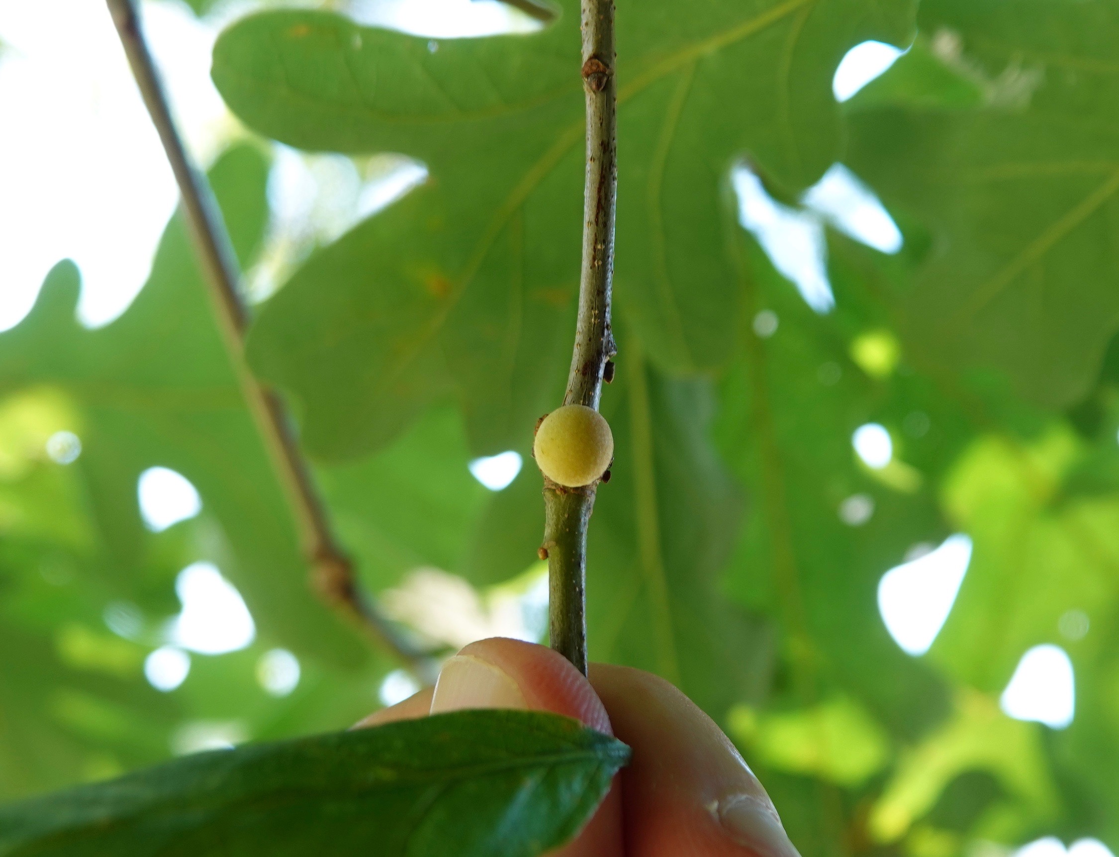 But let’s stick with the tiny gall wasps. (This is a simplistic description, go here for more detail.) They lay an egg on the plant’s leaf or stem. The plant responds by growing around the egg or larva which digs into the plant. Each resulting growth, or gall, is unique to the species of gall-making agent that initiates it. It’s a chemical process, a benign hijacking of the plant’s growth. The sphere on the oak above is sort of a highly modified leaf. The insect larva within is protected by this structure from hungry predators (but parasites can still get in). The gall is also food for the larva. The plant doesn’t seem to be harmed. The wasp emerges from the gall to start all over again, sometimes with an intervening stage elsewhere on the same tree.