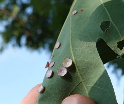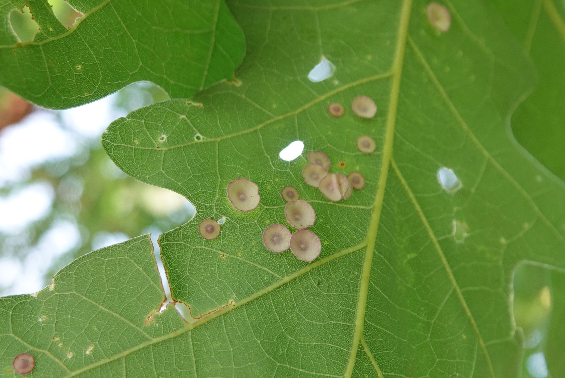 Looking a bit like mushrooms, these galls on the leaves of this white oak in Green-Wood are the results of yet another Cynipidae gall wasp, Phylloteras poculum.