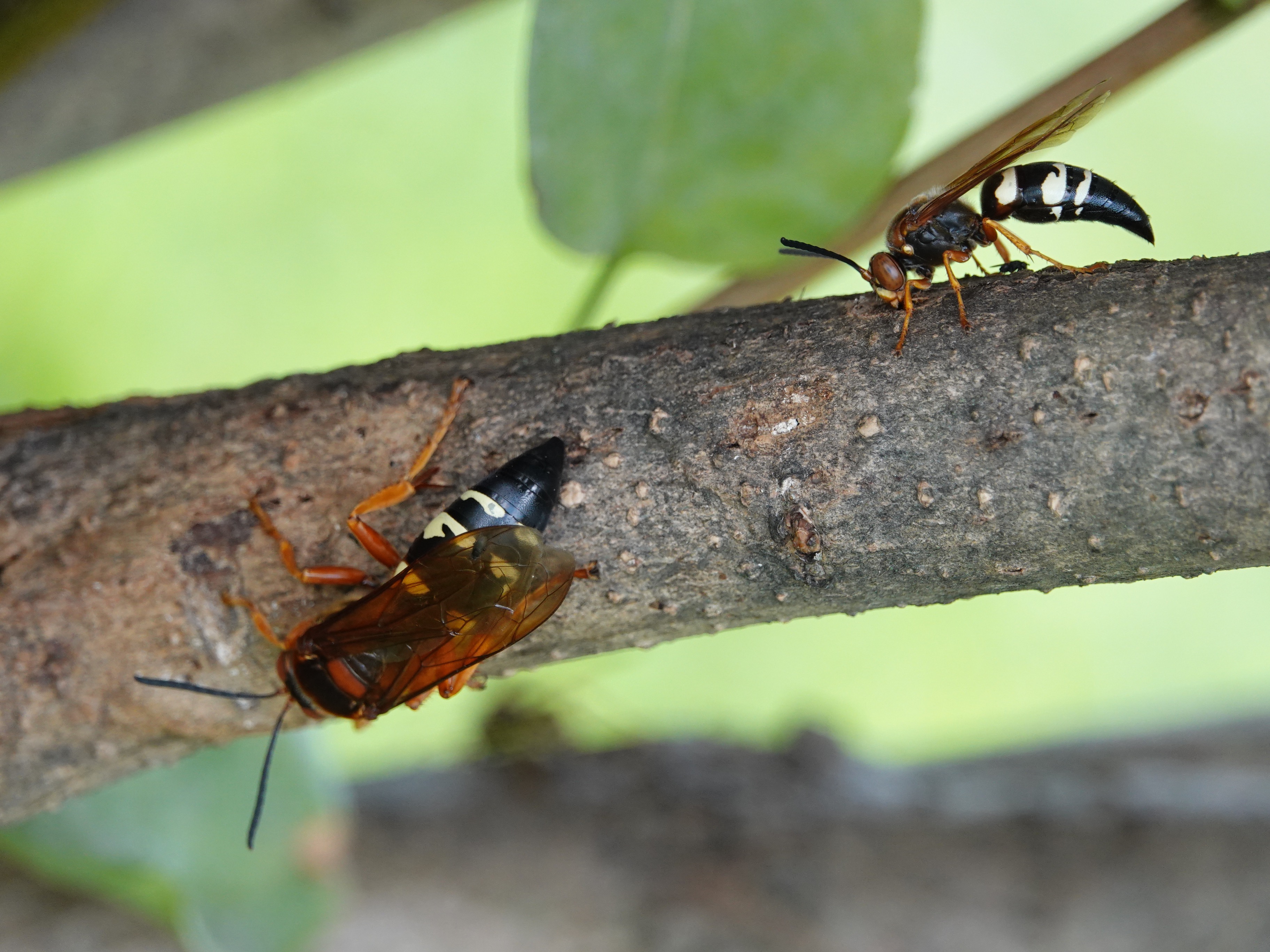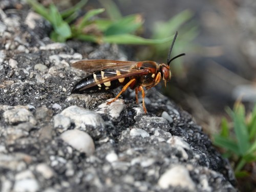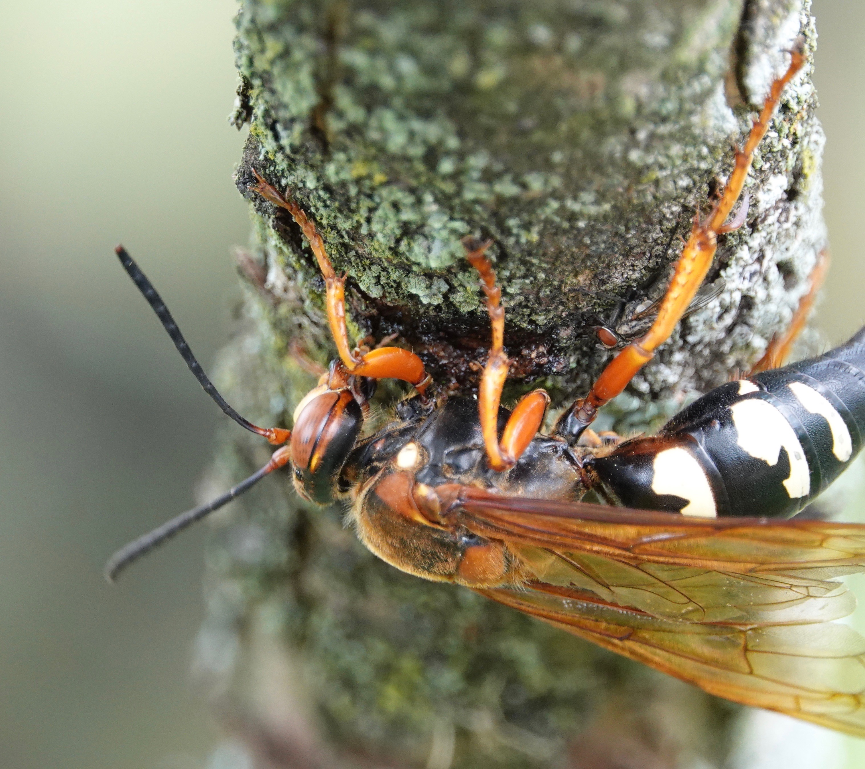 Remember, it’s the larval form that eats the cicada. The adults eat very little, says bugguide. I have seen them taking nectar at flowers before. Recently I hit the mother (and father) lode of feeding for these large wasps. Stay tuned.