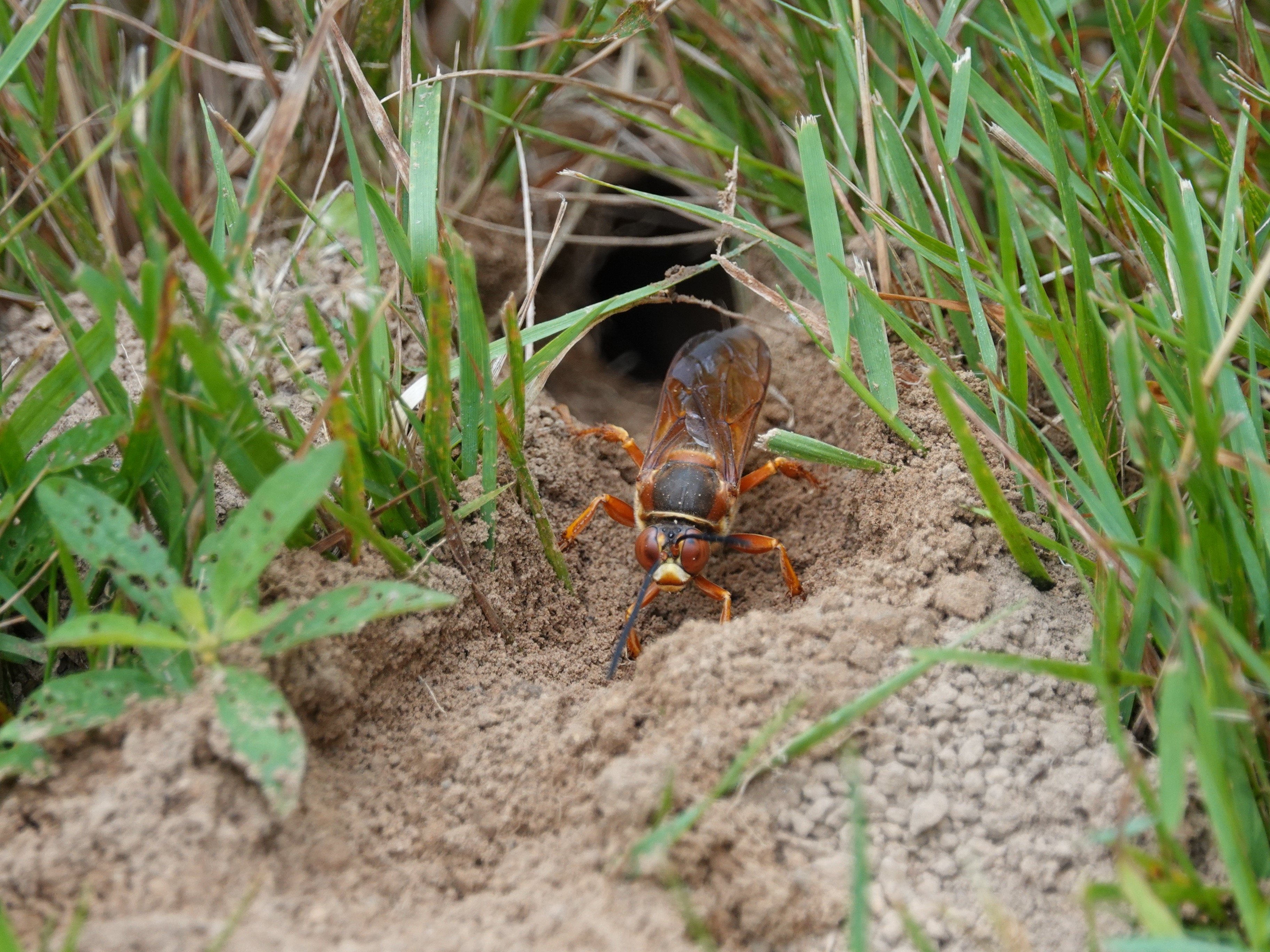 This Cicada-killer Wasp was emerging from her nest. She had just deposited a paralyzed cicada inside and, presumably since this is what they do, laid an egg on the cicada. I tried to get a photo of her carrying her progeny-to-be’s food inside, but she was too fast for me. I waited for about fifteen minutes to see is she would return with another cicada. Not on my watch. I could hear three cicadas in surrounding trees.