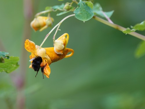 The common Eastern Bumblebee is Bombus impatiens. The flower is jewelweed, i.e. Impatiens capensis.