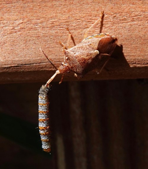 The Eight-spotted Forester being eaten by a Spined Soldier Bug.